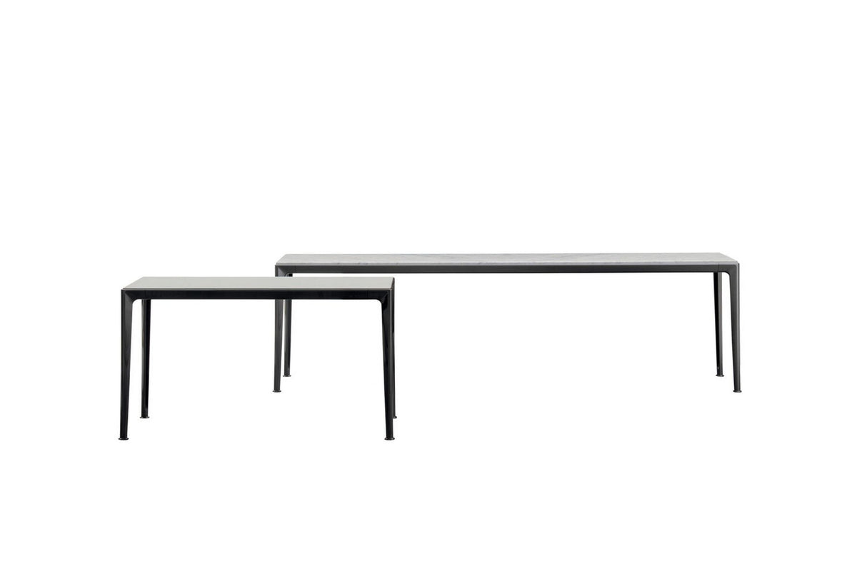 A square variant and three rectangular tables. These are the different versions of the Mirto table, initially designed for outdoor use it has now found inside with its precise formal appearance.