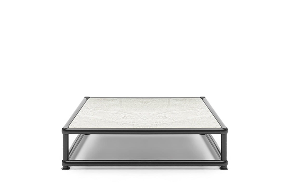 A low table with a linear design underlined by tubular elements in recycled aluminium. It is available in a square or rectangular version with tops in serpentine stone or in enamelled lava stone in different colours to match the semi-gloss finishes of the structure.