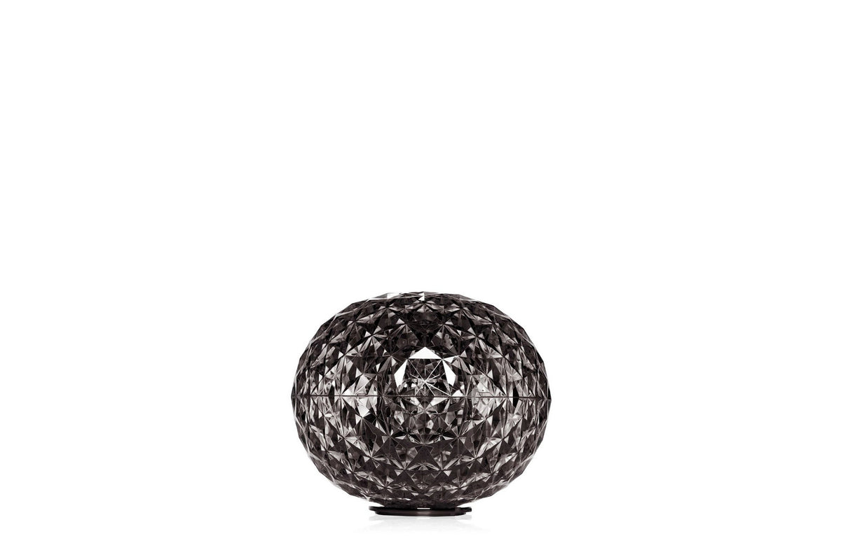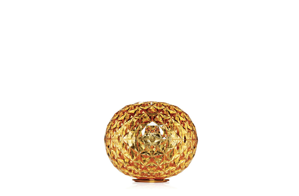 A family of lamps: suspended, for a coffee table and with a metal structure, and the most recent floor version of the lamp is available in two heights: 130 and 160 cm. The distinctive trait is the shape of the slightly elliptical transparent diffuser, which is characterised by a multi-faceted surface, both inside and out, which creates a rich tapestry of reflections.