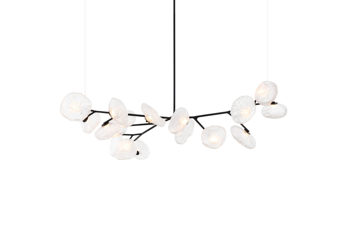 73.17a.1 is an armature arrangement of 17 blown-glass pendants. Each pendant is hand blown into a folded and highly heat-resistant ceramic fabric vessel. Each pendant is housed with a 1.5-watt LED lamp.