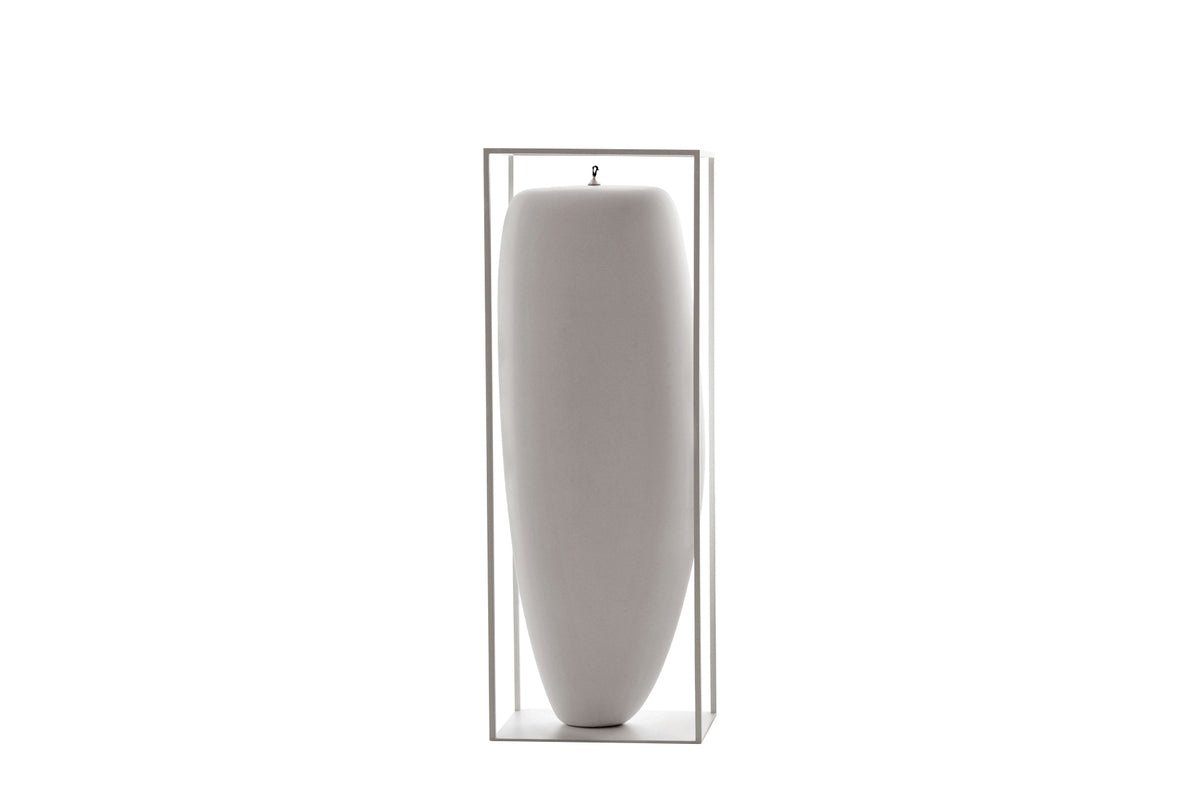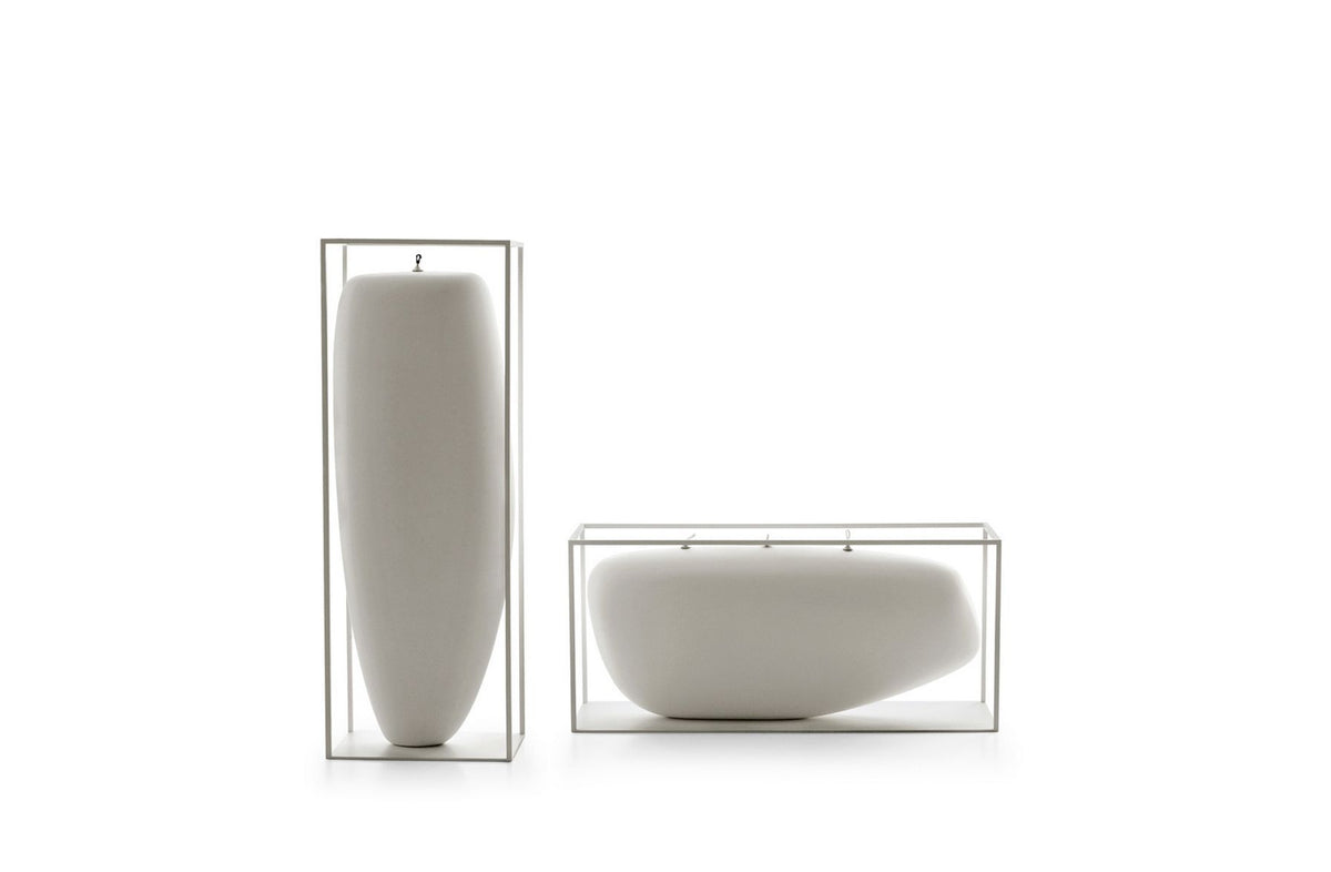 The large oil candles designed by Jean-Marie Massaud are in high density polyurethane resin (Baydur®), with a metallic frame painted matt white.