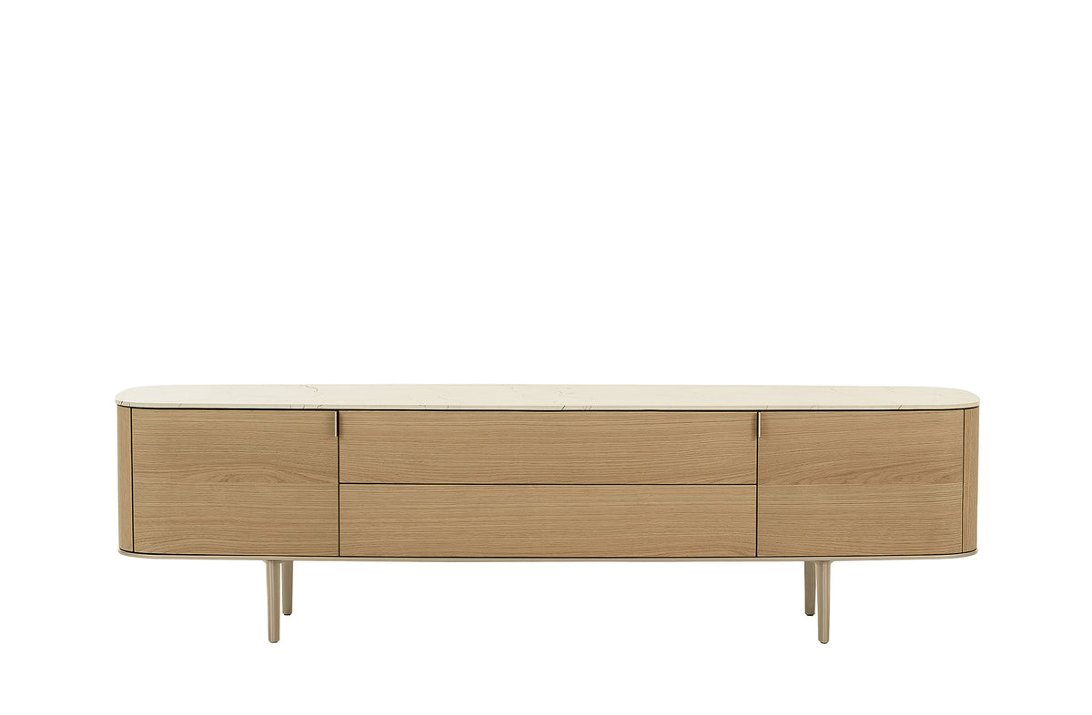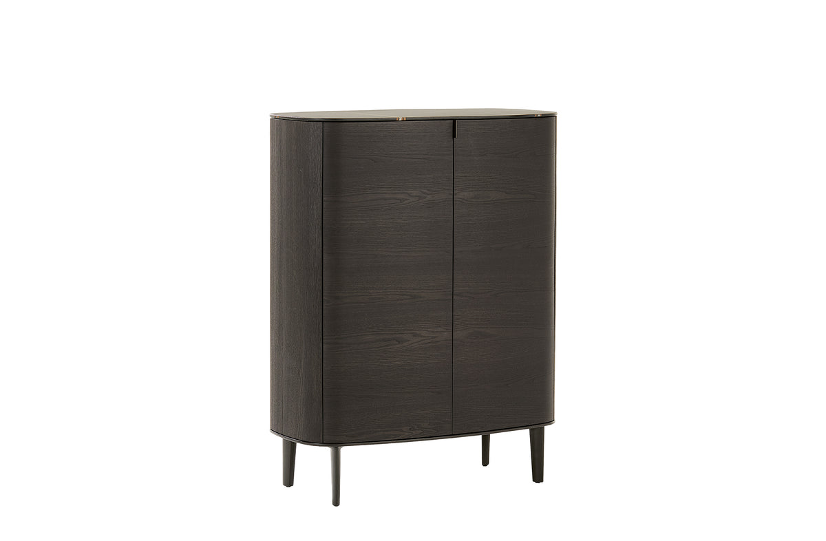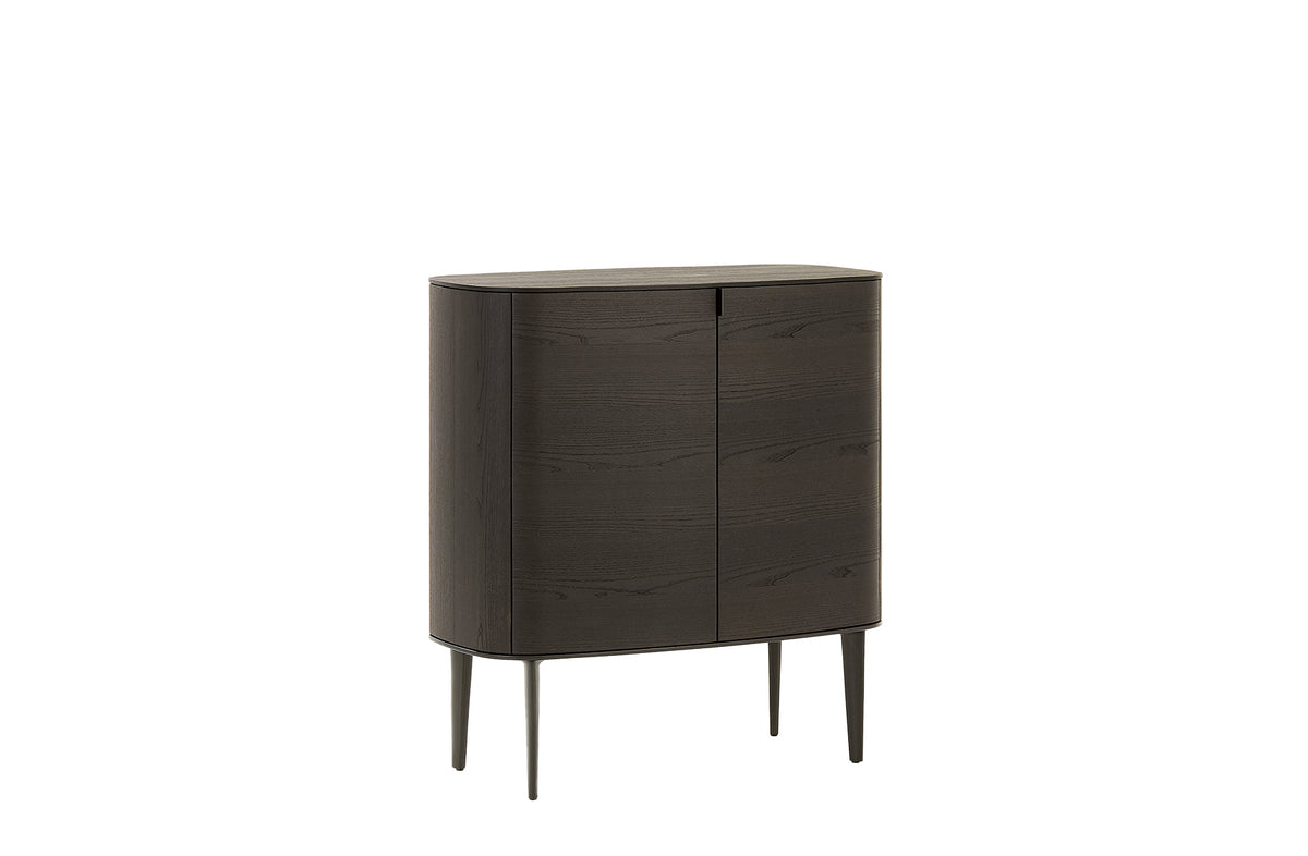 Symphony is a collection of sideboards where the simplicity of the lines is expressed through fine materials and accurate workmanship. The sideboards have an elliptical shape, enhanced by the wood finish. The collection includes elements of different heights and sizes, from the high and medium versions with doors to the low version with drawers or with drawer and open compartment, all on a base with feet.