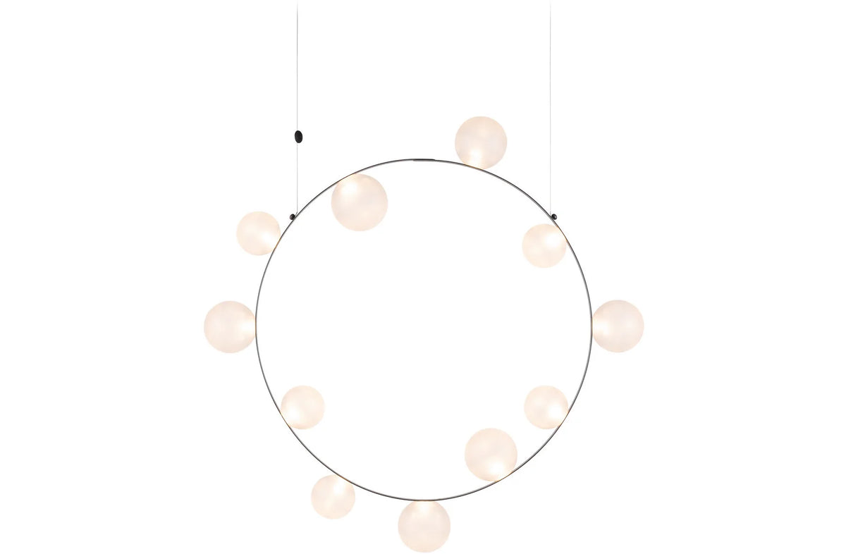 Hubble Bubble, designed by Marcel Wanders, is an airy and joyful suspension lamp. Either 7 or 11 glass LED bubbles, available in oil-iridescent and frosted versions, are stuck on a circular metal frame. Hubble Bubble can be hung both horizontally and vertically and is powered through Electrosandwich® by Marcel Wanders. Hubble Bubble is a perfect statement piece, that for example could perform above a table in an atrium.