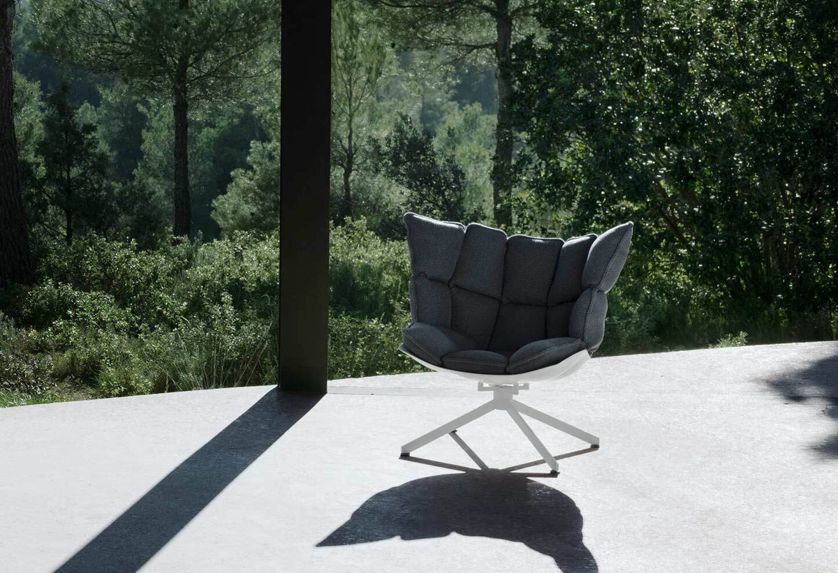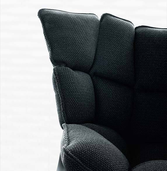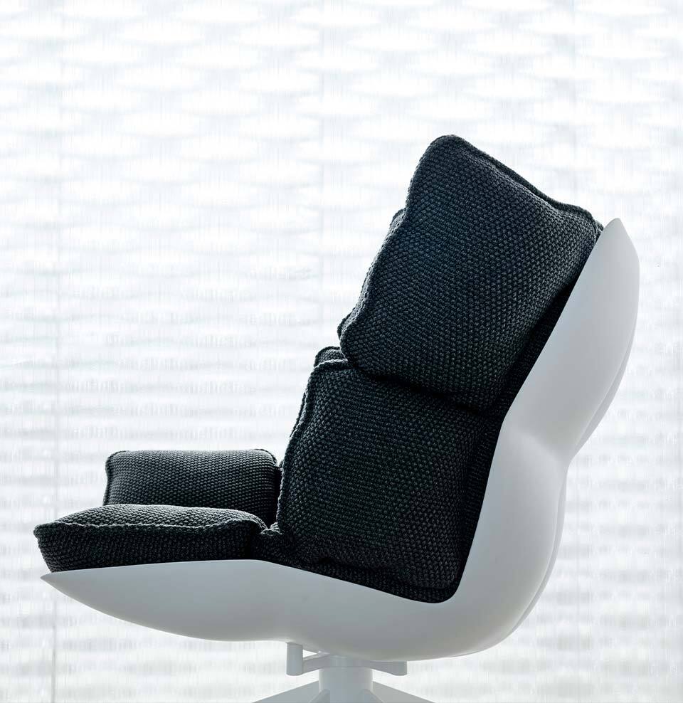 Comfort and eco-sustainability are the key words for describing the Husk chairs. A collection that is a tribute to softness and an invitation to relax thanks to the generous extra soft cushions with a capitonné design. The hard shell, available in different colours, is made of Hirek®, a special plastic material made up of recycled and recyclable polymers. The cushions come in three versions, with larger sizes on the seat or on the back, or with headrest. The series is completed by the coordinated footrest that makes Husk armchair perfect for every need.