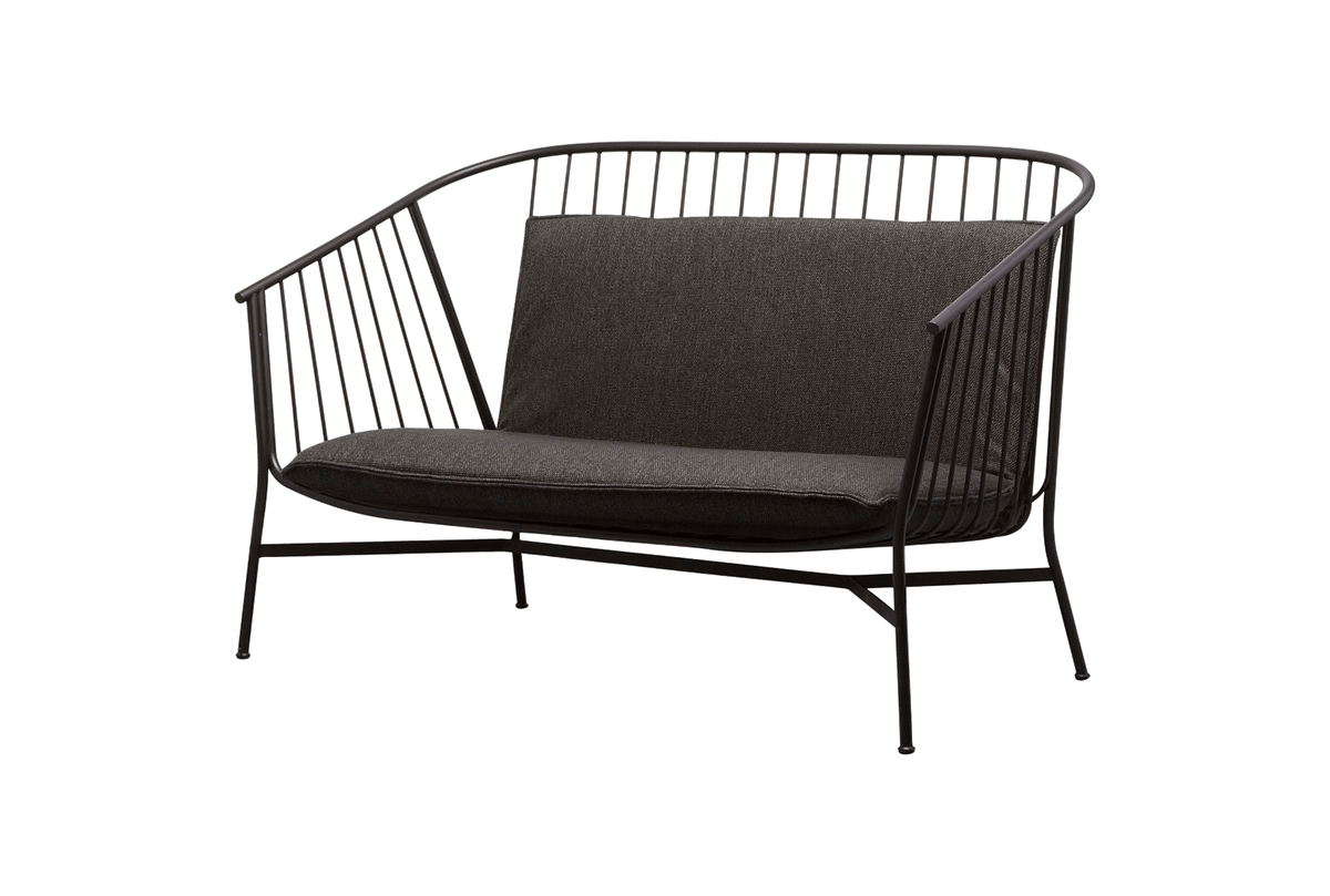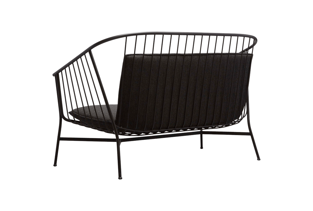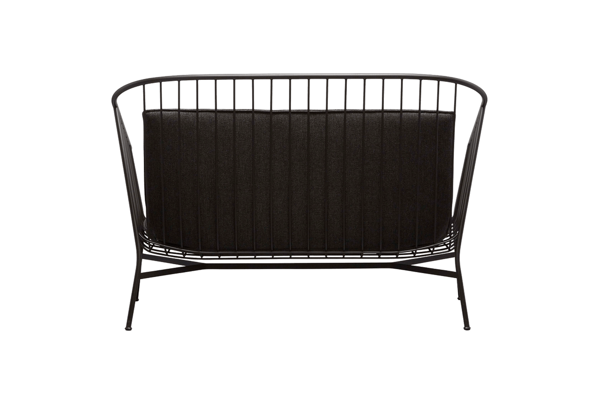 Perfect for a sunny alcove or apartment terrace, the tub-shape and compact curves of the Jeanette sofa gives this distinctive piece its broad appeal. A combination of precision metal work and traditional hand finishing, the Jeanette sofa is a sculptural wire lounge, neatly contrasted by soft inviting cushions and an elegant high-back design. Available in black frame with three different cushion styles that come in upholstered outdoor fabrics, indoor fabrics and leather. An additional outdoor cover is also available.