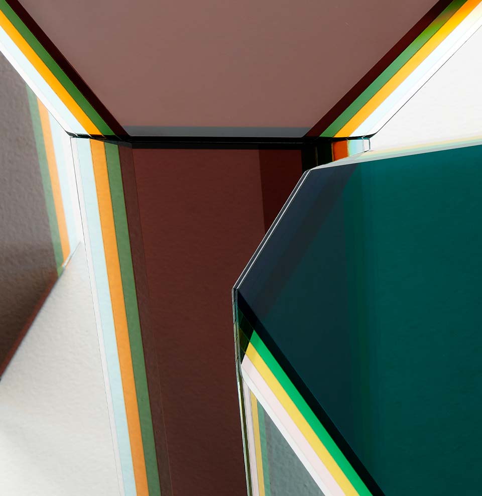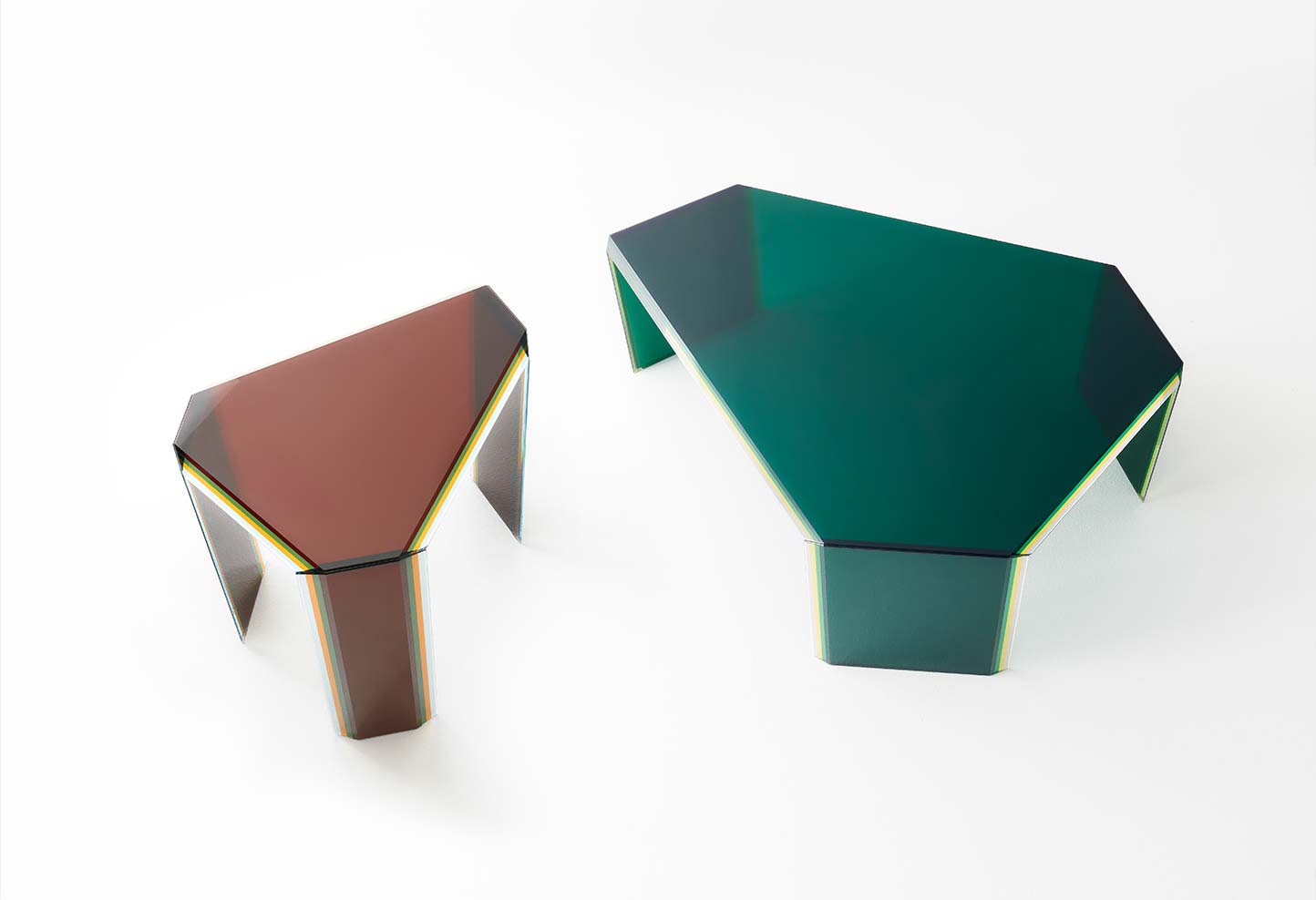 Collection of high tables, low tables and console, made in multi-layered and multichromatic glass, created by laminating five slabs of 5mm extralight glass each with a different coloured film. The multi-layered glass is in different shapes, shiny ground polished and “faceted” by means of unique bevels accentuating through the transparency of the glass the stunning multicoloured material. The different components are then welded together in total clarity, by means of a special gluing technique, so creating very precious “furniture jewels”. Available in two colors: ocher and green.
