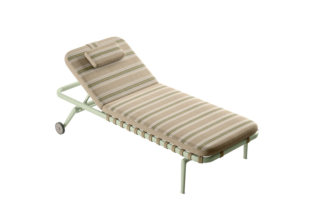 The Erica ’25 chaise longues take up the elements that characterize the outdoor seating collection of the same name: the powder-coated die-cast aluminium structure which offers lightness and durability and the interlacing in polypropylene strips reinforced by a high-resistance internal core. Comfort and practicality are guaranteed by the backrest that can be adjusted in different positions, by the padded mattress and by the design that makes them stackable. The wheels they are equipped with allow them to be moved easily.