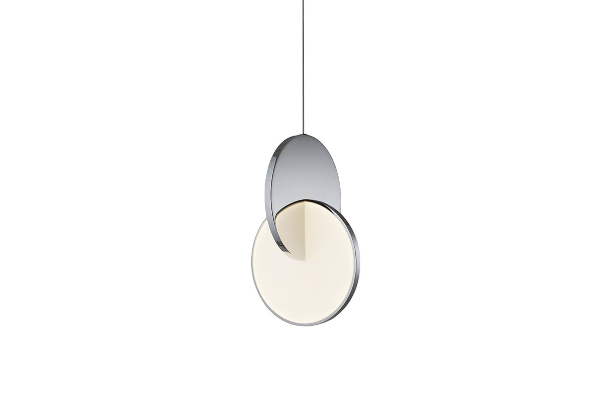 Eclipse Pendant is celestial in both its name and inspiration. Mirror-polished chrome and acrylic discs interact, dissect and obscure, which both eclipses and reveals its illumination to the viewer at the same time. Eclipse is available as a singular pendant light, tiered chandelier and table lamp in polished chrome and polished gold finishes.