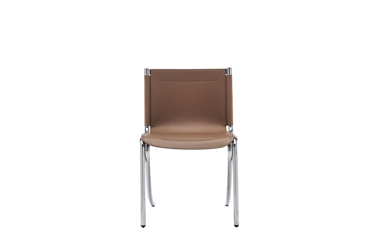 Celebrating stainless steel in the Bauhaus tradition, the tubular chrome-framed Jot chair takes its swooping, balletic form into the contemporary era with a new version purified of any paint or dye that would hide the essence of its powerful metal and rawhide leather elements. An iconic example of Giotto Stoppino masterful use of cantilevered chair styles and his exploratory method with materials.