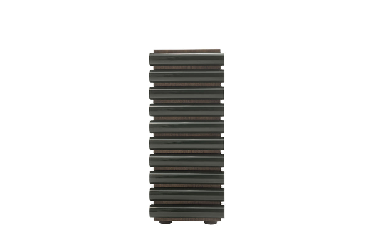 A playful, spirited pillar of drawers, the Storet cabinet epitomizes the visionary touch of Nanda Vigo designs. In both its elongated vertical edition, and in the nightstand designed by Nanda Vigo but manufactured for the first time only now, the Storet reflects today’s advances in production, with the walnut’s visible grain illuminating Acerbis’s modern expertise in utilizing extensive wood surfaces.