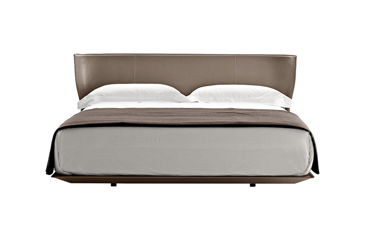 A sheet of leather “pinched” in two places at the base: here is where the movement and natural inclination of the Alys headboard originate. The Buratti brothers are once again managing a material that they know well because they’ve already used it on the Doyl chair when they explored the theme of upholstered leather, made more comfortable than with traditional processes. For Alys, they designed a comfortable, protective headboard, a very effective shape that has thin perimeter strips marked by a lengthwise seam. The bed frame can be placed at two different heights, thanks to a standard equipment made of two sets of feet (h. 5cm or 15cm). The bed surface was designed to be low specifically to suggest an effect of suspension and floating of the super-comfortable mattress.
