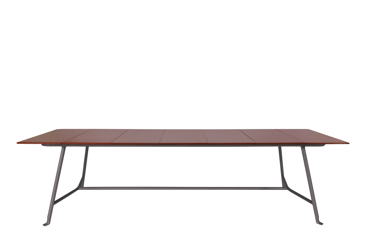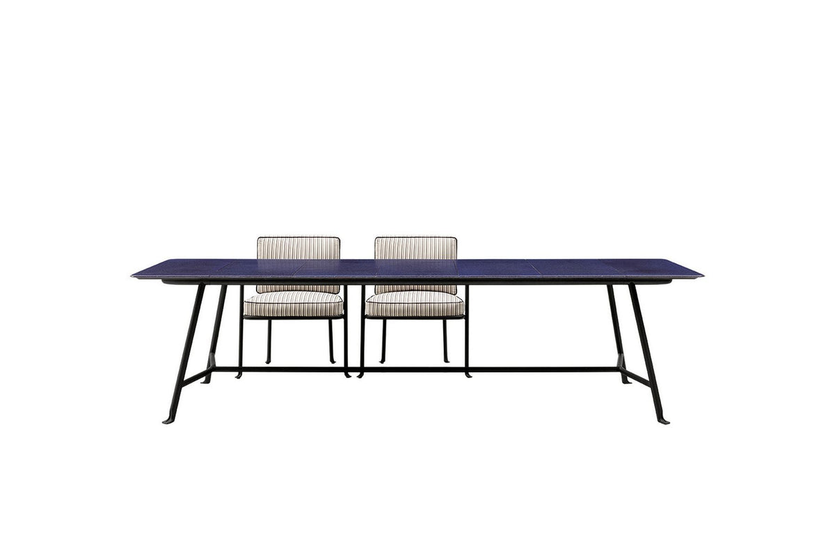 The dining tables reflect the design and shades of the seating structures, but use steel instead of aluminum to support distinctive tops in glazed lava stone. The lava stone comes from the slopes of Mount Etna (Sicily, Italy) and is available in large rectangular tiles in three bright colours which harmonize perfectly with the whole collection.
