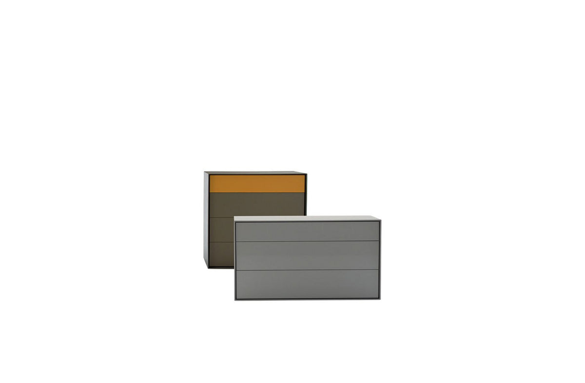 A large family of storage units enhanced by chromatic variations and plays of bright and matt finishes, while maintaining the formal rigour of the design. They are customised by an important detail: the greater depth of the tops and sides, as compared to the drawers, that contribute a sense of depth to the front.