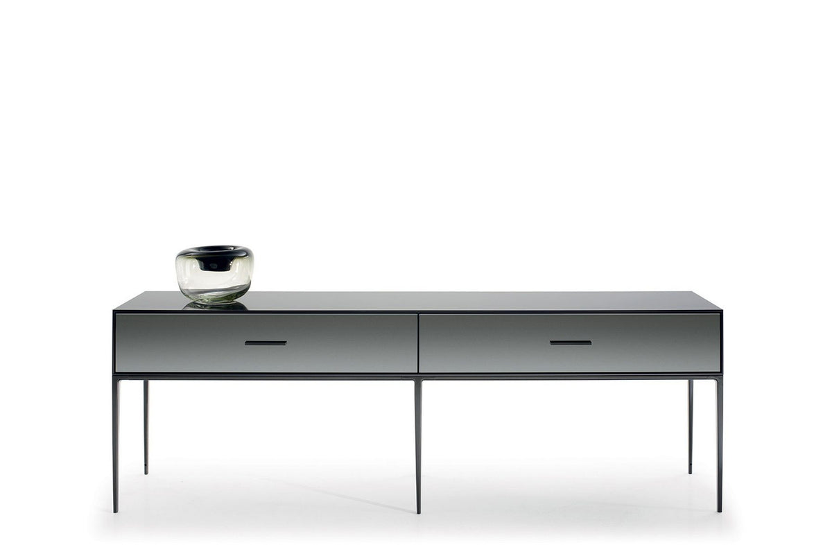 Eucalipto is the name of a series of units designed for the living room, dining room or wherever a special focus is required. Eucalipto enriches B&B Italia’s collection with a sophisticated touch suggesting original glamorous combinations. For the carcass acrylic finish that develops in three variants with different combinations for doors and drawers: black structure with doors and drawers in grey mirror, in black back-painted glass or in eucalyptus frisé wood with glossy finish; bronze structure with doors and drawers in bronzed mirror, in bronze back-painted glass or in eucalyptus frisé wood with glossy finish; teal blue structure with doors and drawers in grey mirror teal in teal blue back-painted glass or in eucalyptus frisé wood with glossy finish.