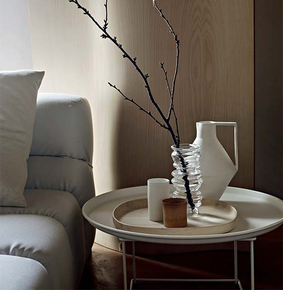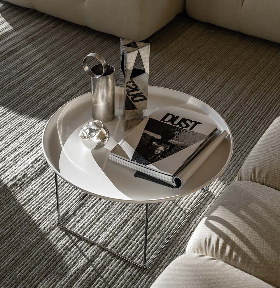 The theme of the tray, in white, black or with a copper finish, is picked up to create three tables, whose lightness results from the steel frame. They can even be stacked.