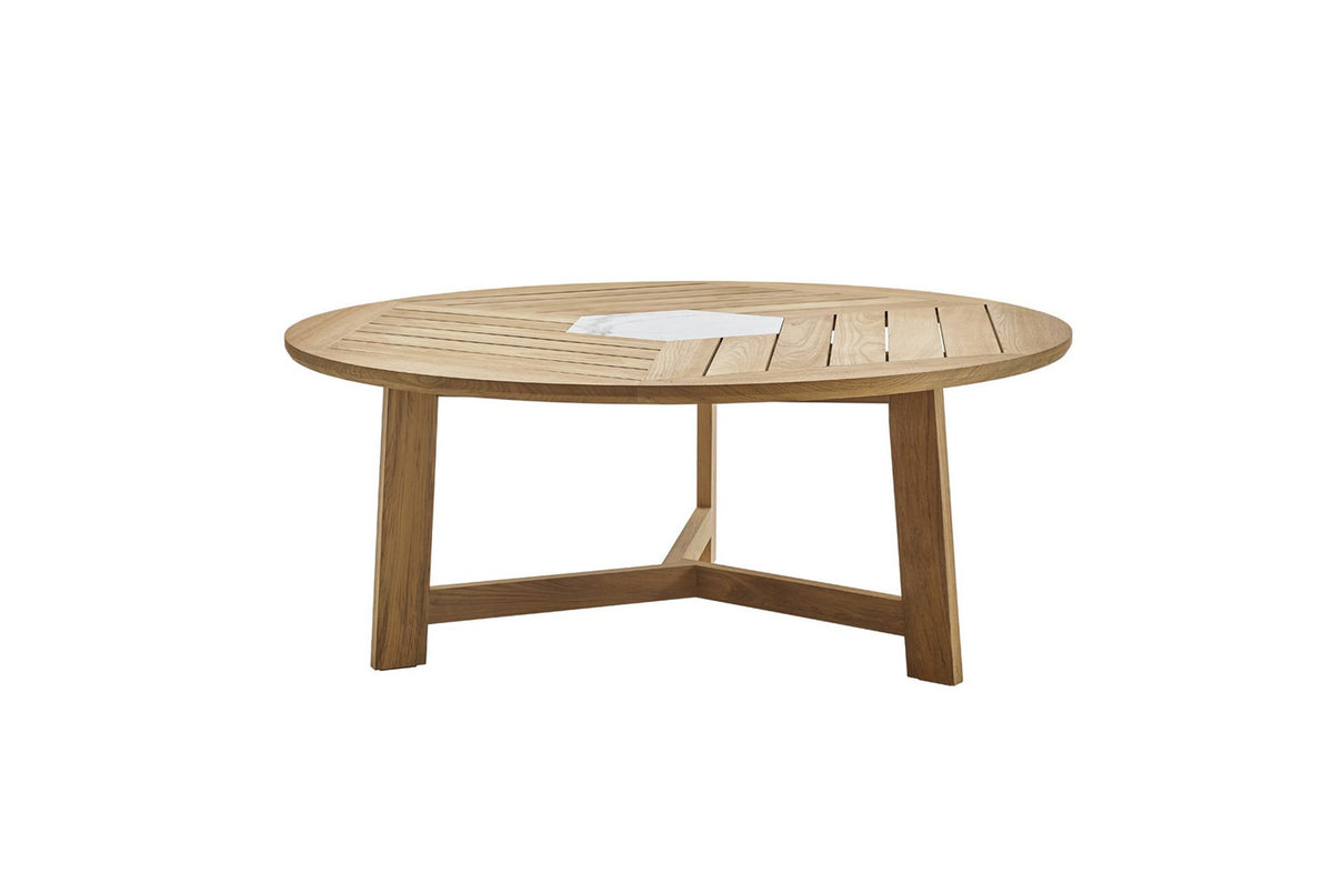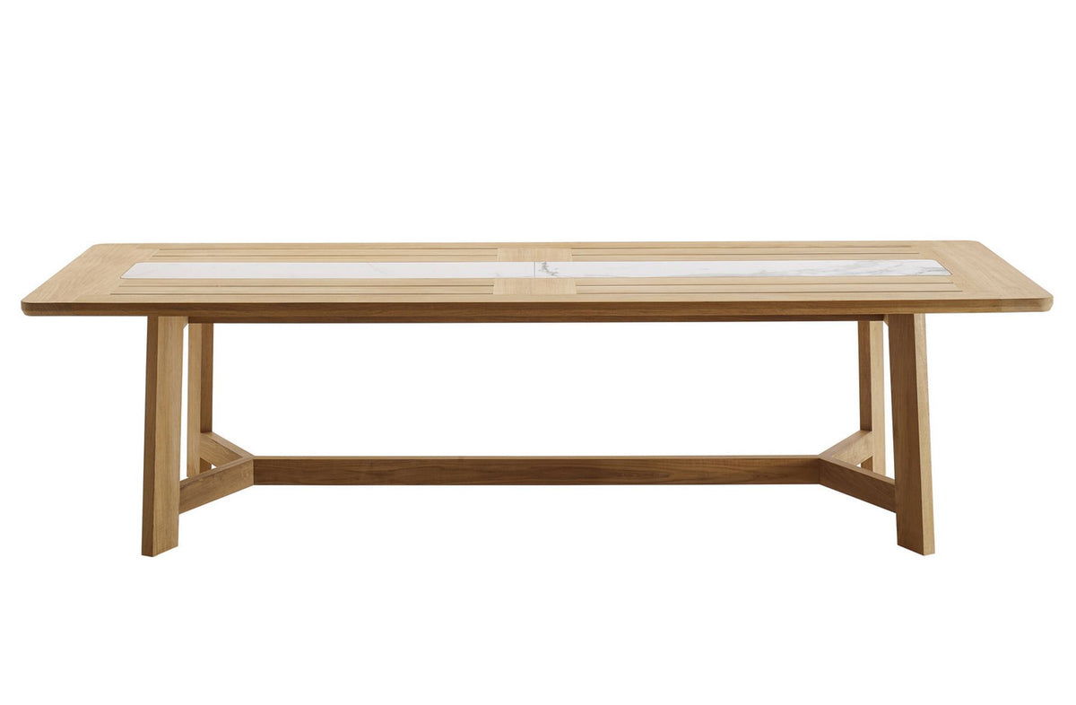 Collection of large rectangular and round dining tables featuring natural teakwood structural details and designed tops, studied to match central inserts made of Calacatta white porcelain stoneware. The same collection features a chair, always in natural teakwood, with sinuous harmonious lines that are clearly inspired by northern trends.
