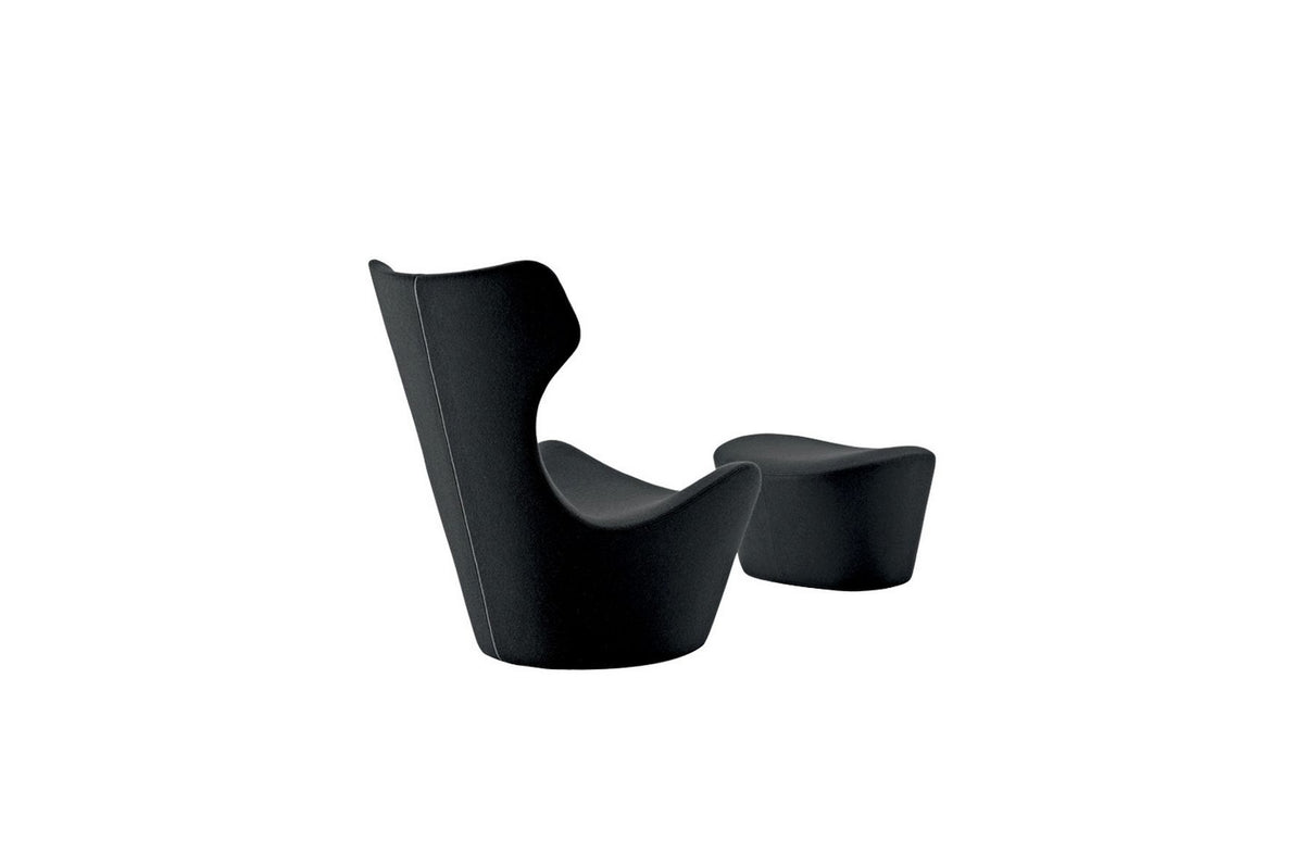 The name recalls the butterfly because, as explained by the author, “the backrest designs the two wings with the head resting between them and protected by them.” It seems carved out of a block of material from which its inverted truncated cone shape derives. With a powerful personality, its swivel system facilitates contact with the surrounding environment.