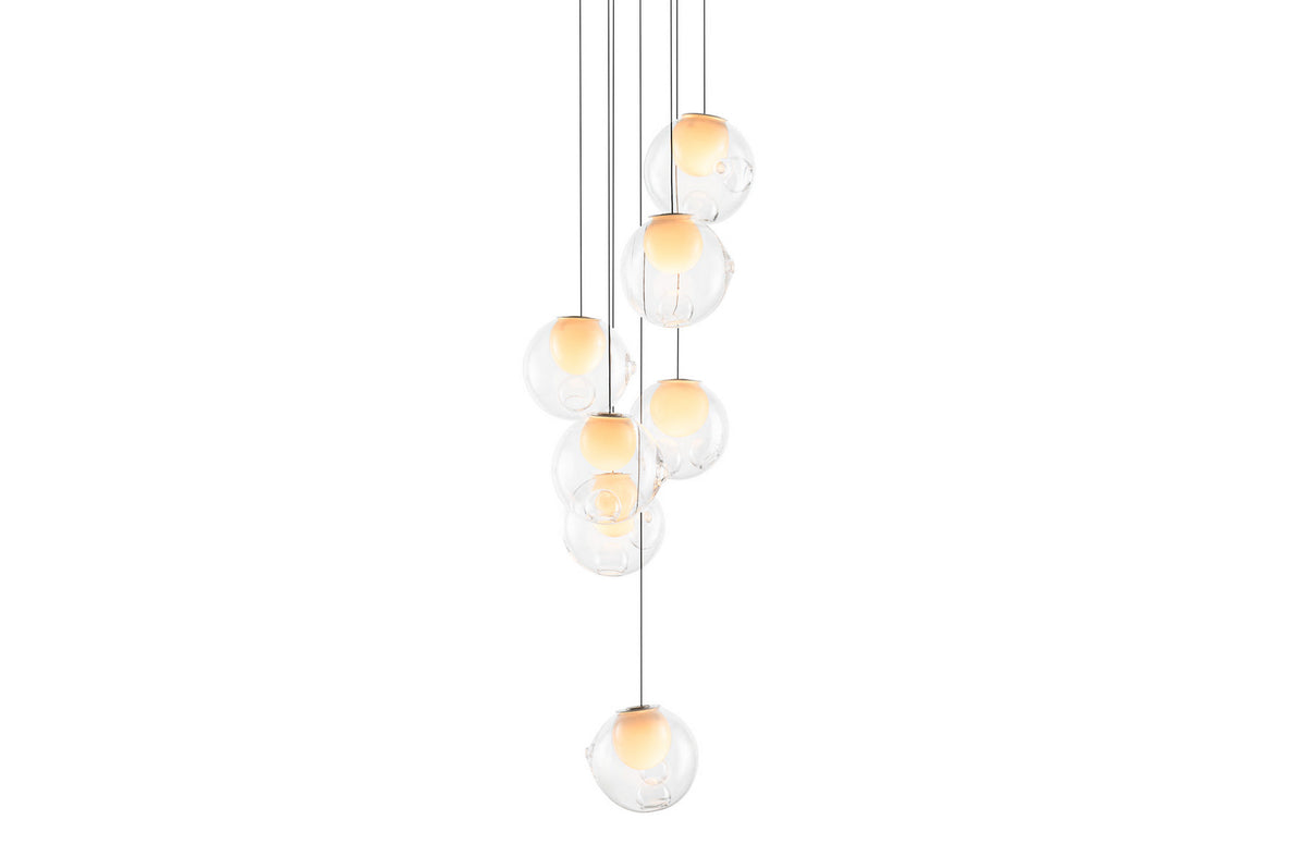 28.7 is a low-voltage arrangement of 7 blown-glass spheres. Each sphere contains an interior landscape of satellite shapes, including an opaque milk glass diffuser that houses either a 20-watt xenon or 1.5-watt LED lamp.