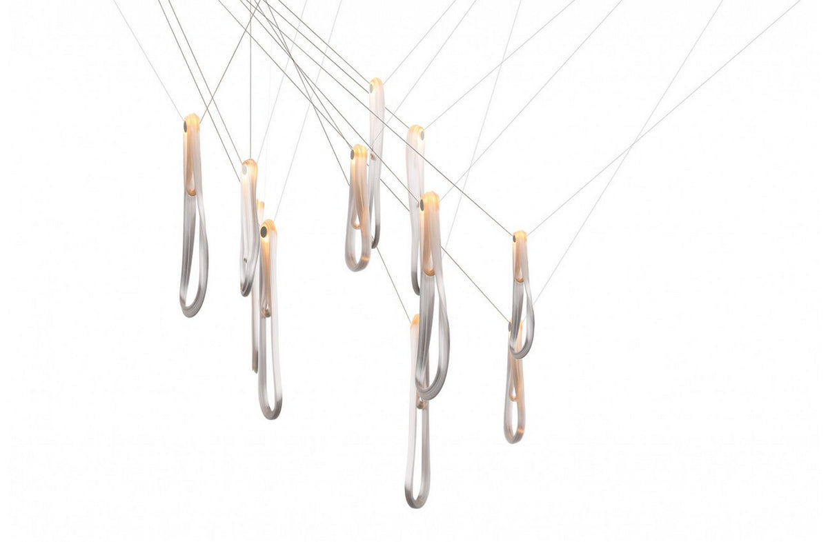 87.11 features 11 pendants suspended from a canopy and swag hook. Pendants can be hung from any number of optional swag points mounted on or away from the canopy.