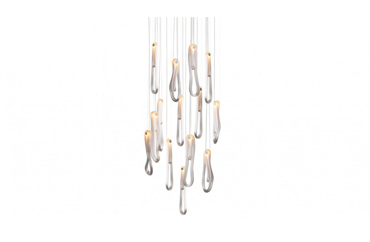 87.14 features 14 pendants suspended from a canopy and swag hook. Pendants can be hung from any number of optional swag points mounted on or away from the canopy.