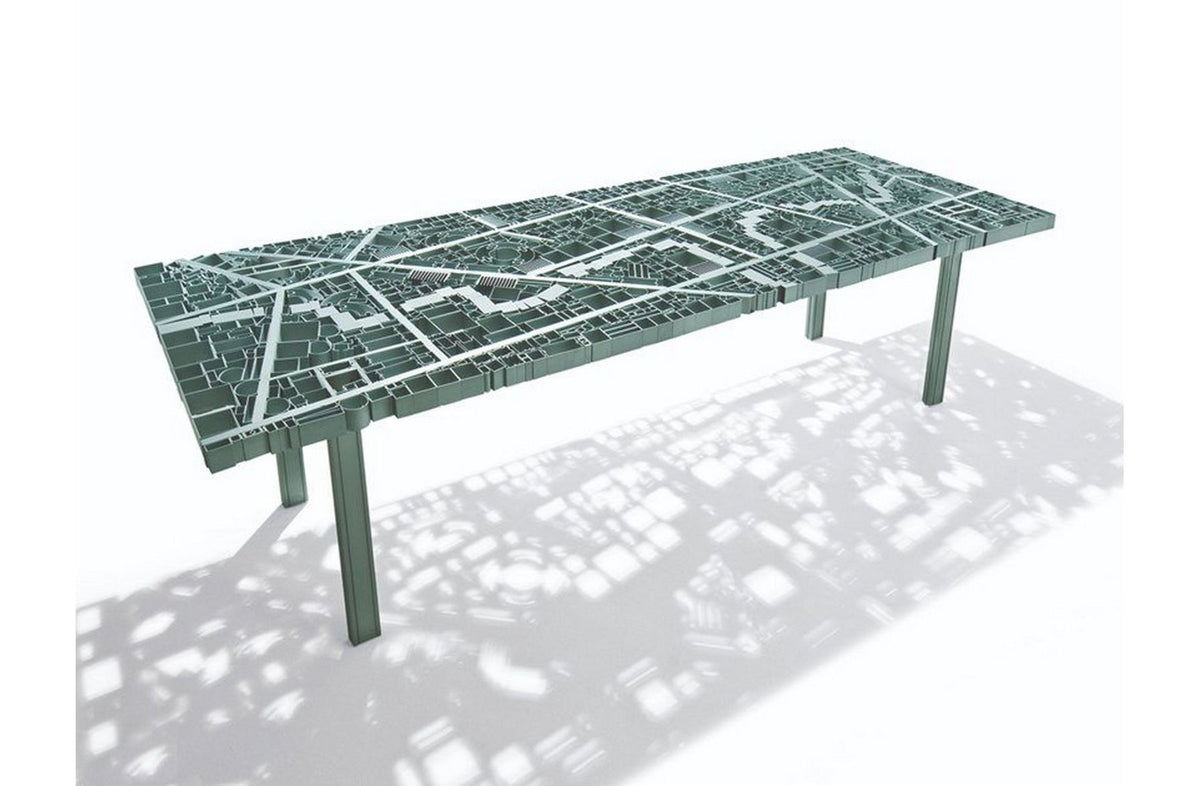 Inspired by the layout of the capital of Iraq, it resembles an industrial architecture model. The top is made up of hundreds of different extruded aluminum pieces, hand welded to form a single surface completely perforated.