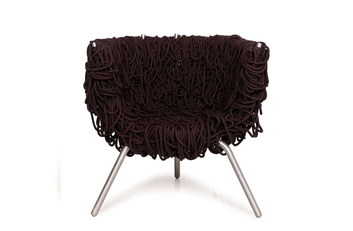 Wrap-around armchair with steel frame. Innovative chair, created by the overlapping of hundreds of twists of about five hundred meters of special rope with acrylic core, on the base frame.