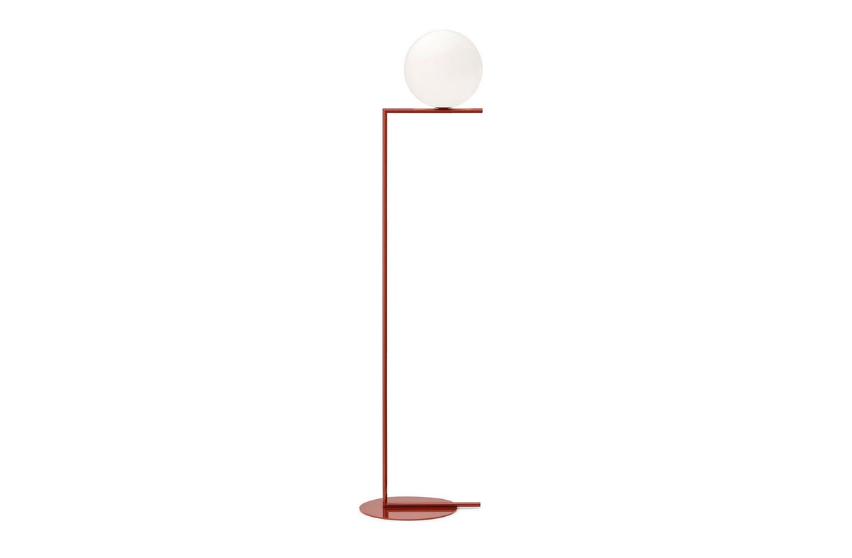 Floor lamp providing diffused light. Frame in brass, brushed and transparent varnished or chrome steel. Blown glass opal diffuser.