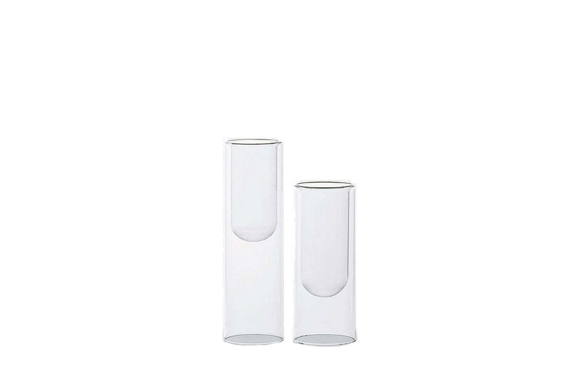 Cylindrical vases in borosilicate transparent glass, TuTube is classic and elegant. Thanks to a complex and refined blowing manufacturing, a concavity, presenting continuity of solution with the outside, is created in the inside of the cylinder. Available in two different heights.