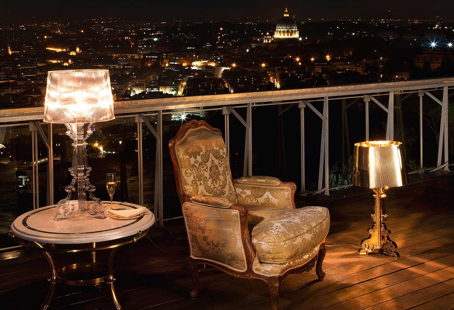 Bourgie unites classicism, wealth and tradition with technological innovation. The baroque-style base consists of three decorated elements that interlock, while the large shade is created with a pleated effect which creates a multitude of reflections when lit. Thanks to a special system used to hang the shade, three different heights can be obtained, altering them to suit personal preference, depending on the use to be made of the lamp: 68, 73 and 78 centimetres.
