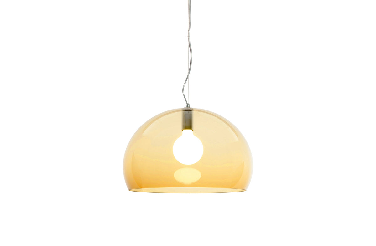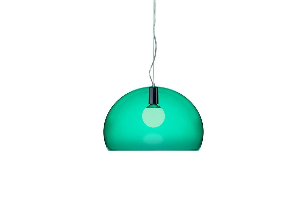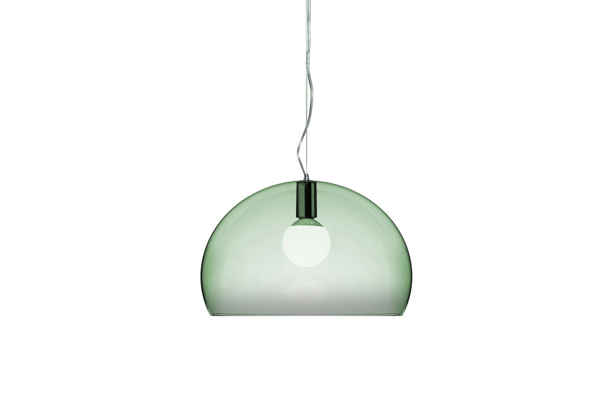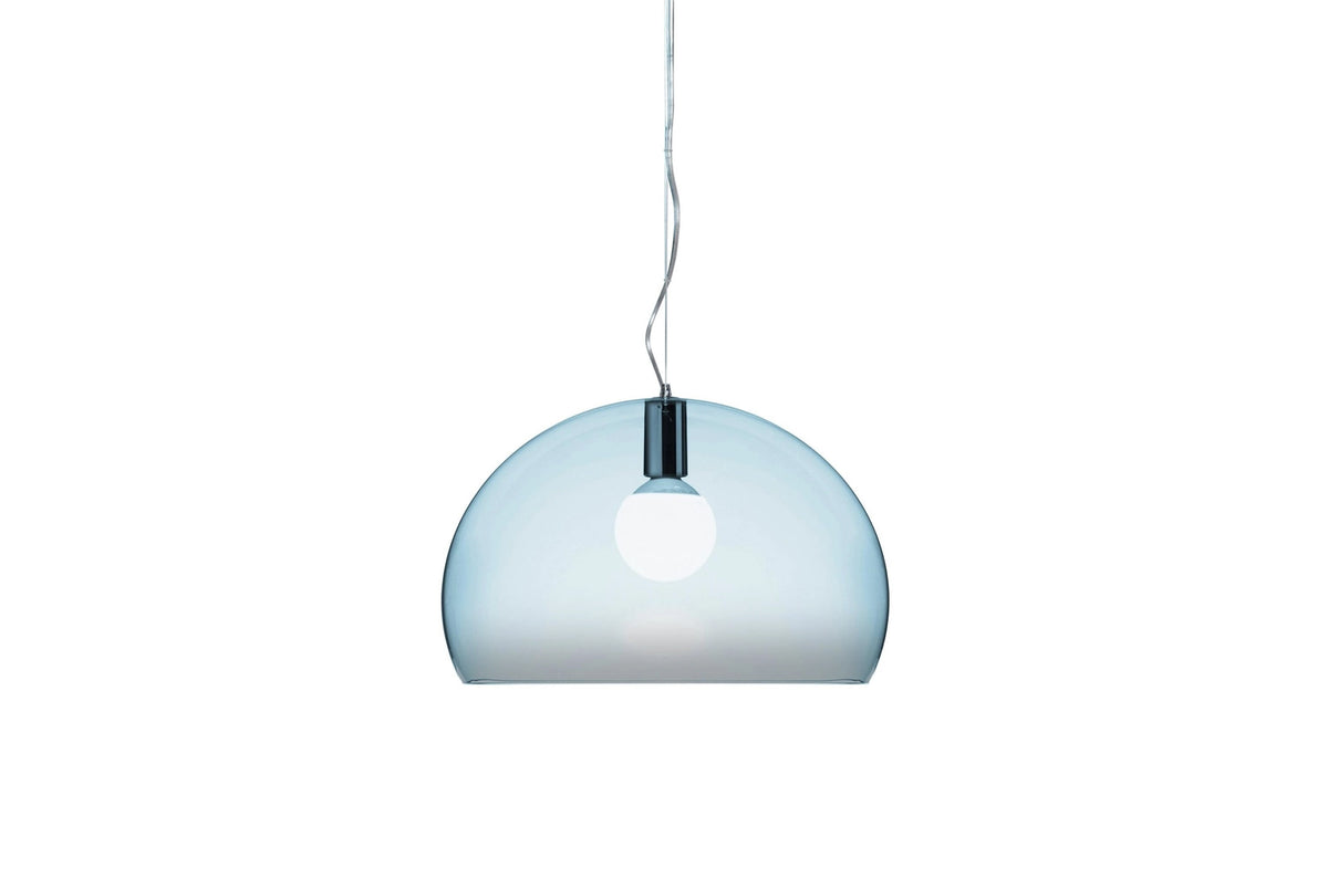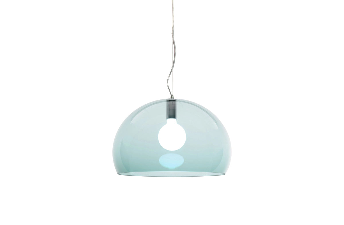 FL/Y is an essentially-styled suspension lamp. The particular transparency of the material and the sheen of the colours recreate the idea of a soap bubble, shimmering iridiscently in the light. The shade is not perfectly hemispherical, with the cut-off falling just below the level of the diameter, offering greater concentration of the light. The lamp is available in three different sizes: Fl/Y (diameter 52cm, shade depth 33cm), Small Fl/Y (diameter 38cm, shade depth 28cm) and Big Fl/Y (diameter 83cm, shade depth 55cm).