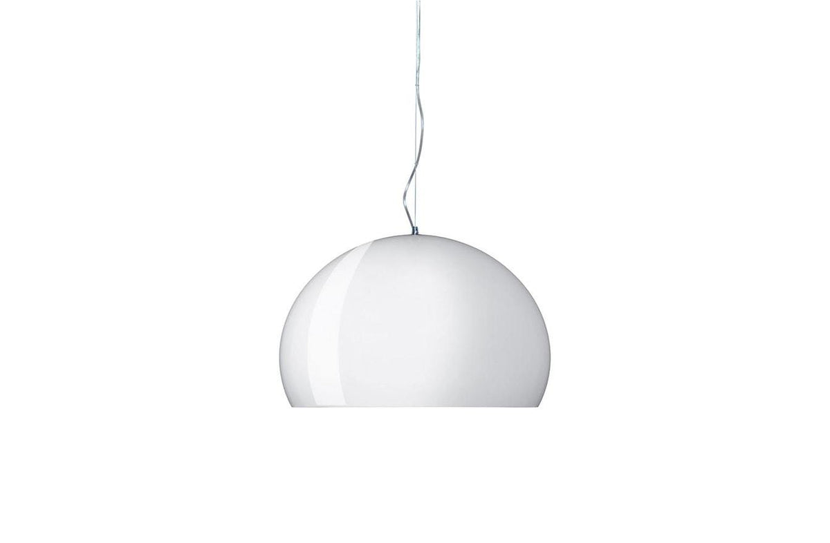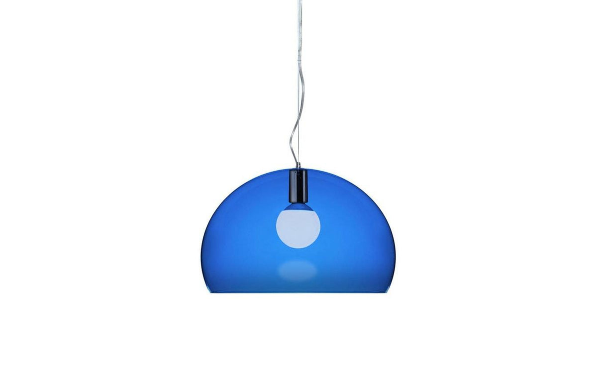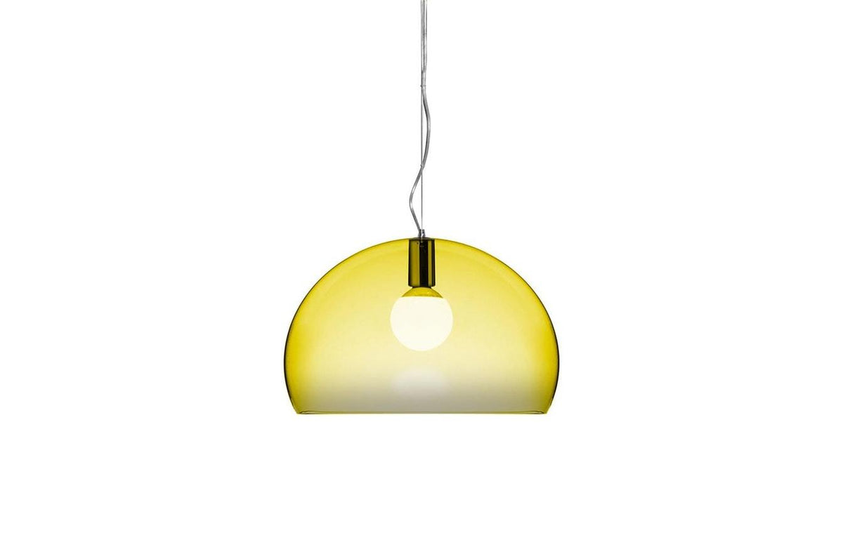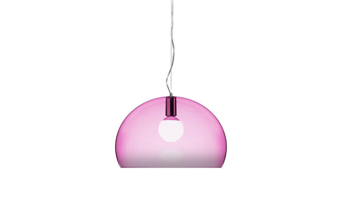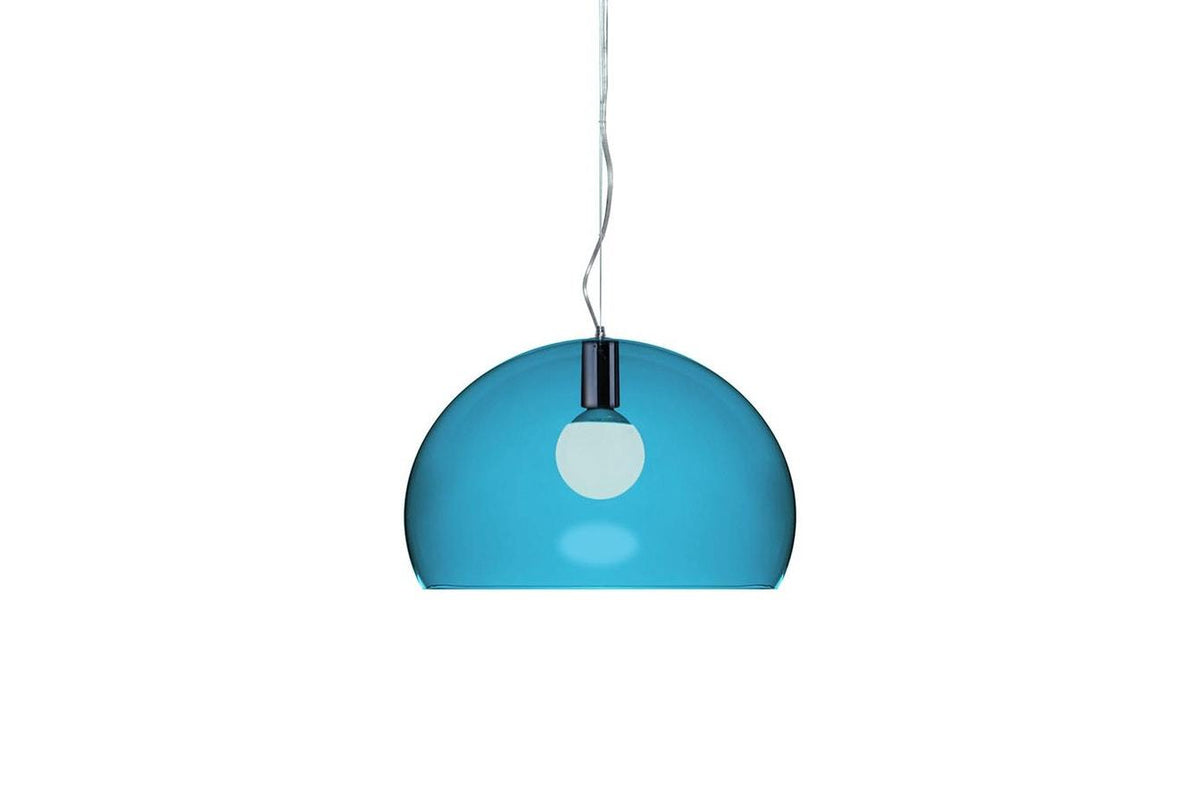 FL/Y is an essentially-styled suspension lamp. The particular transparency of the material and the sheen of the colours recreate the idea of a soap bubble, shimmering iridiscently in the light. The shade is not perfectly hemispherical, with the cut-off falling just below the level of the diameter, offering greater concentration of the light. The lamp is available in three different sizes: Fl/Y (diameter 52cm, shade depth 33cm), Small Fl/Y (diameter 38cm, shade depth 28cm) and Big Fl/Y (diameter 83cm, shade depth 55cm).