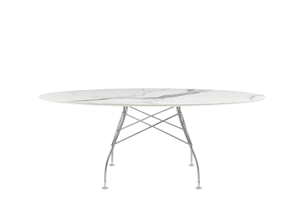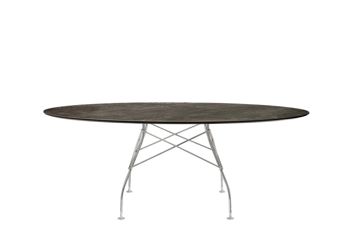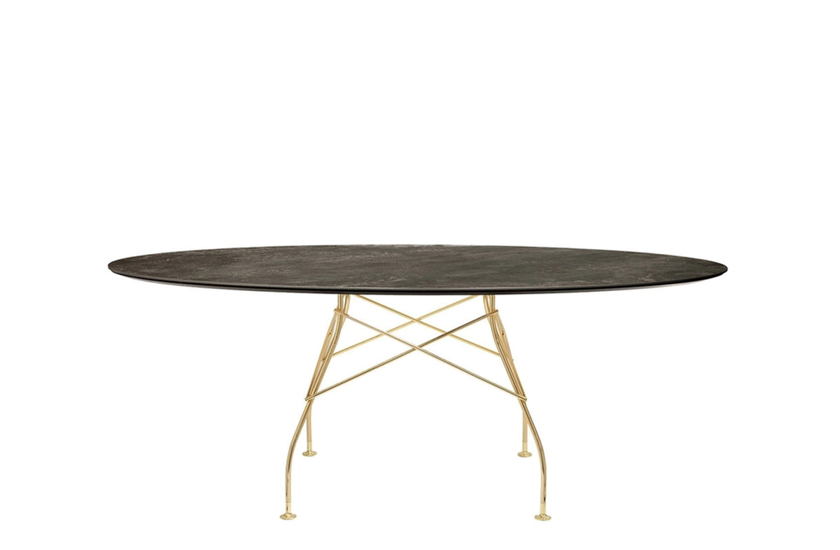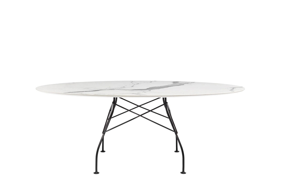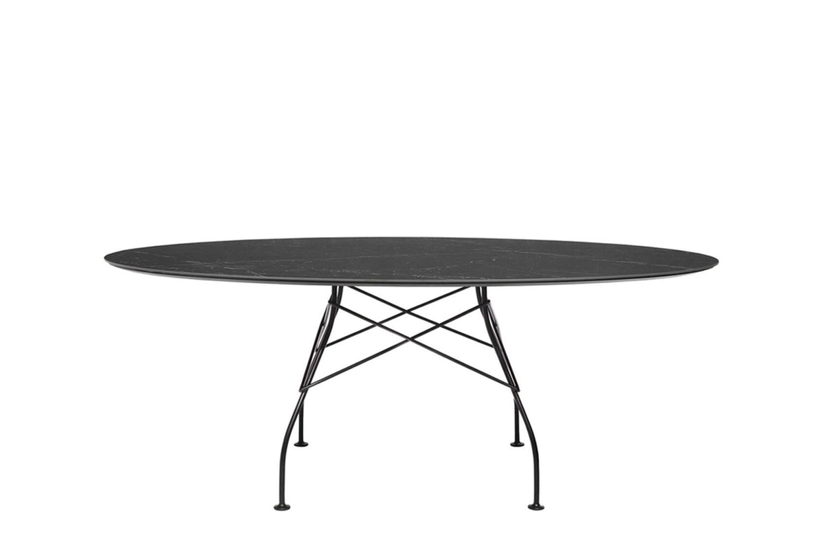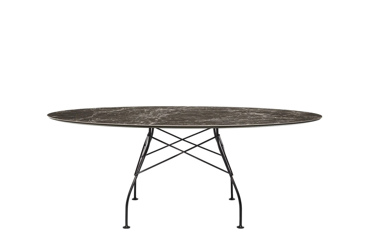 A family of tables ideal for the home and office. The light steel structure is made particular by the use of the cross element that joins the legs on each of the four sides, supporting the top. The collection comprises square, oval and round versions.