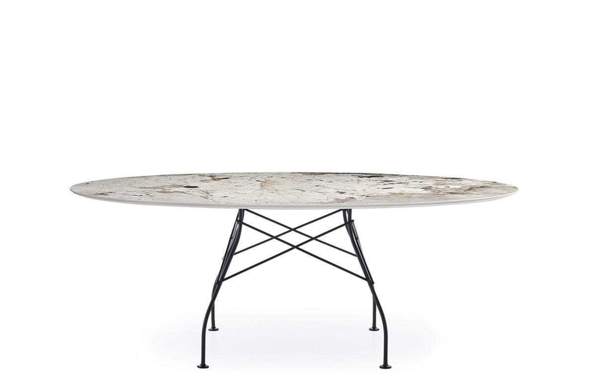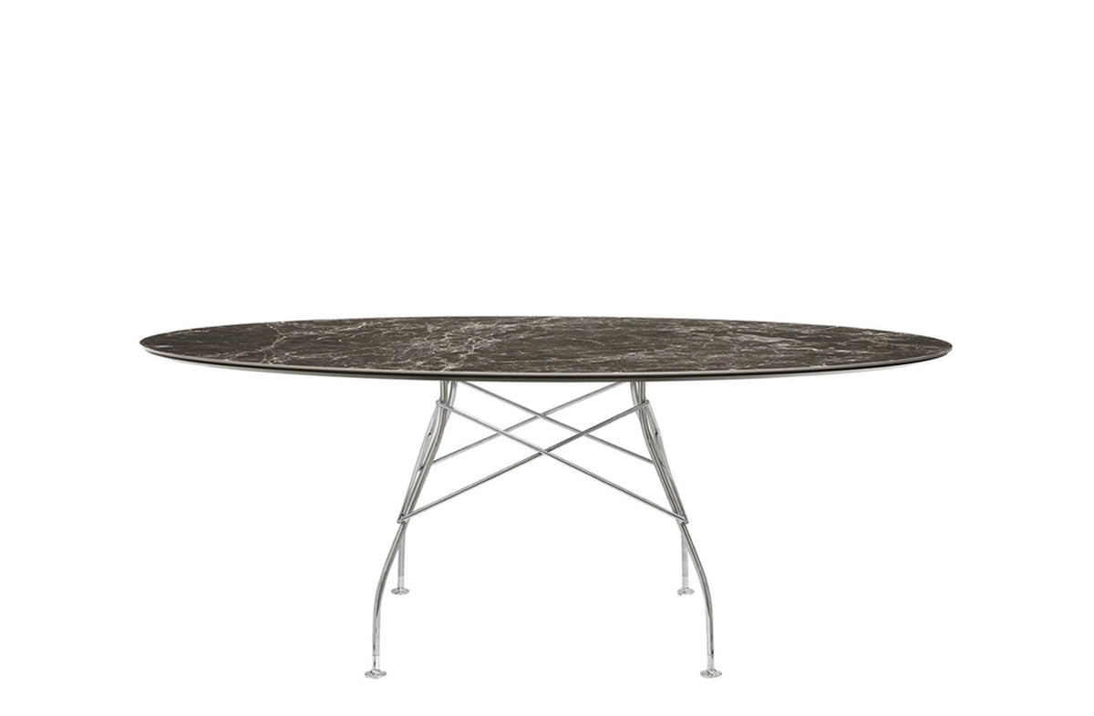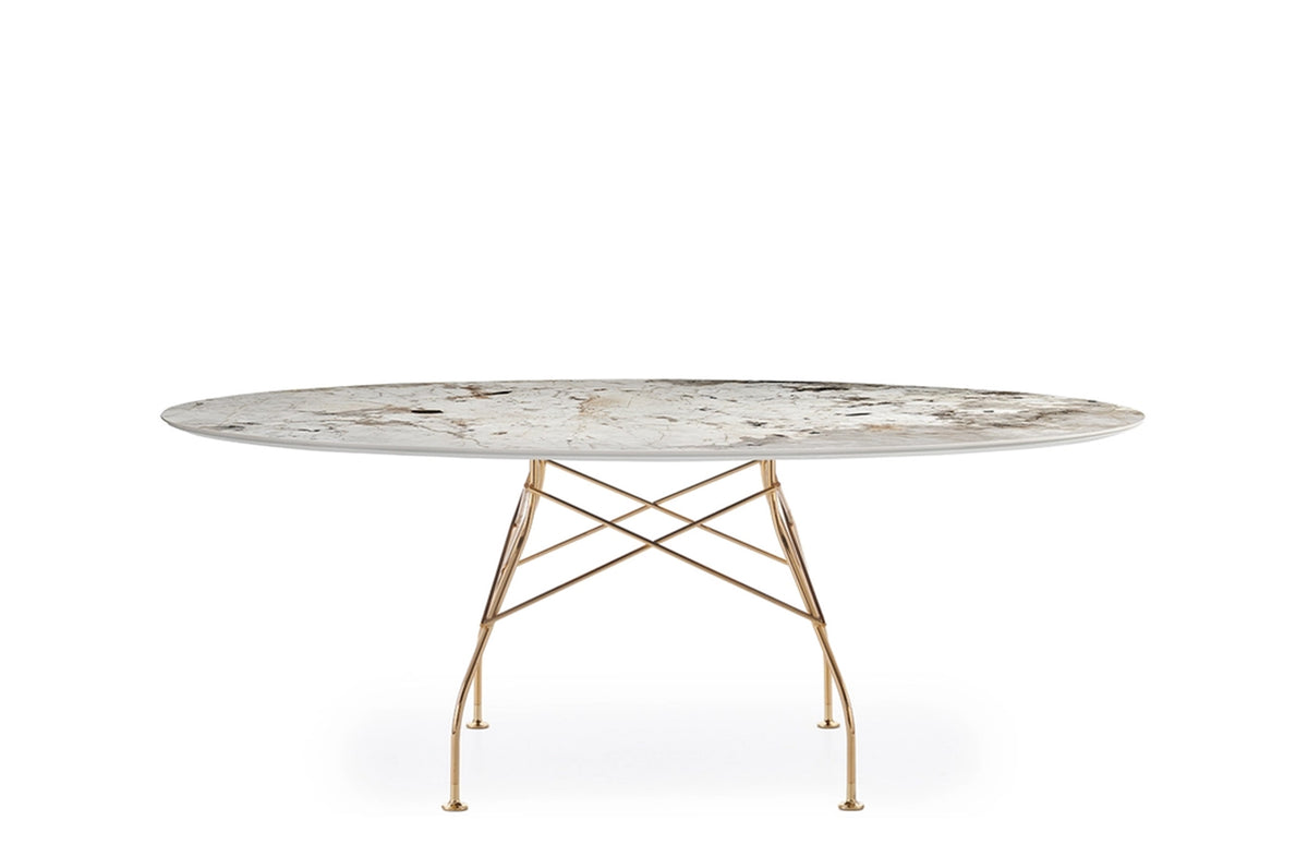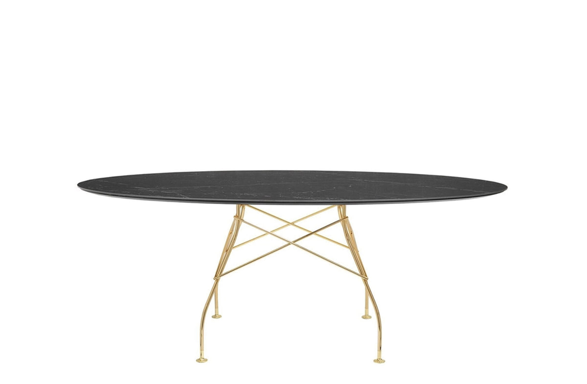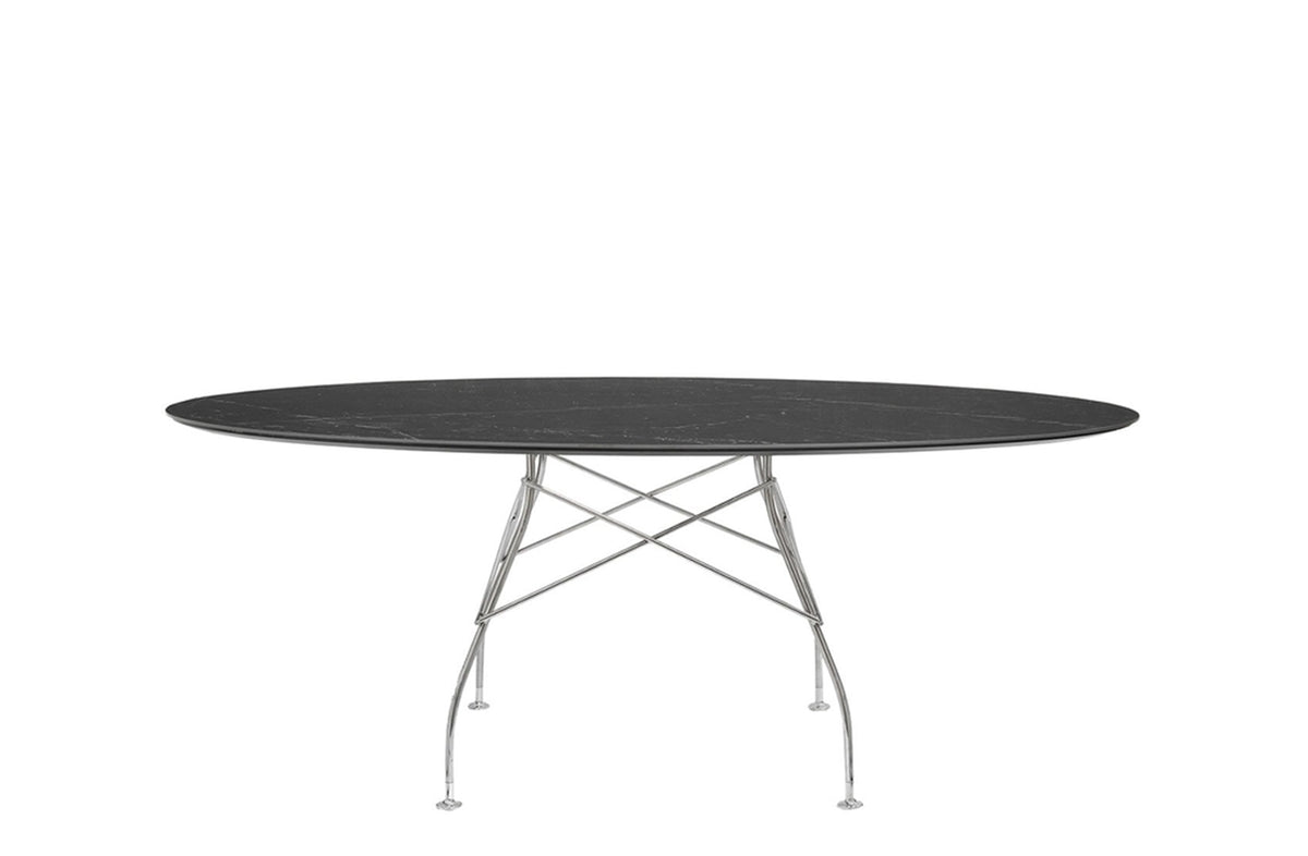 A family of tables ideal for the home and office. The light steel structure is made particular by the use of the cross element that joins the legs on each of the four sides, supporting the top. The collection comprises square, oval and round versions.