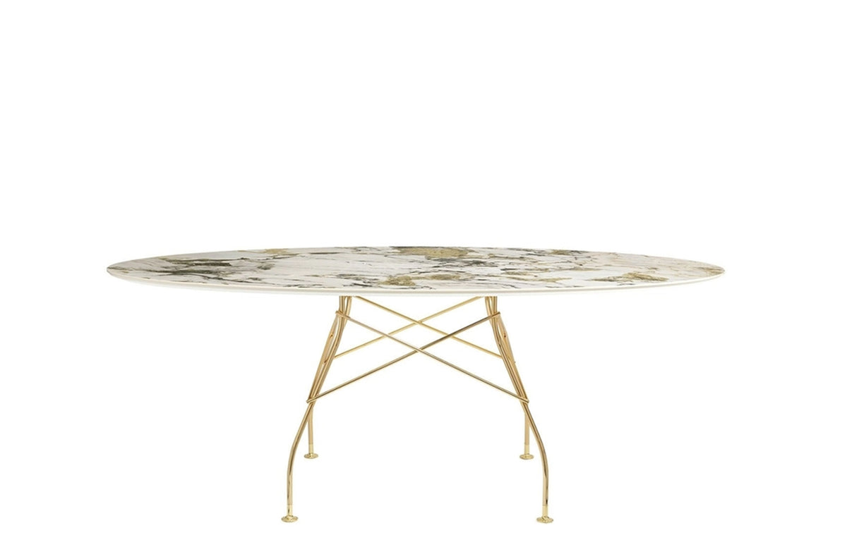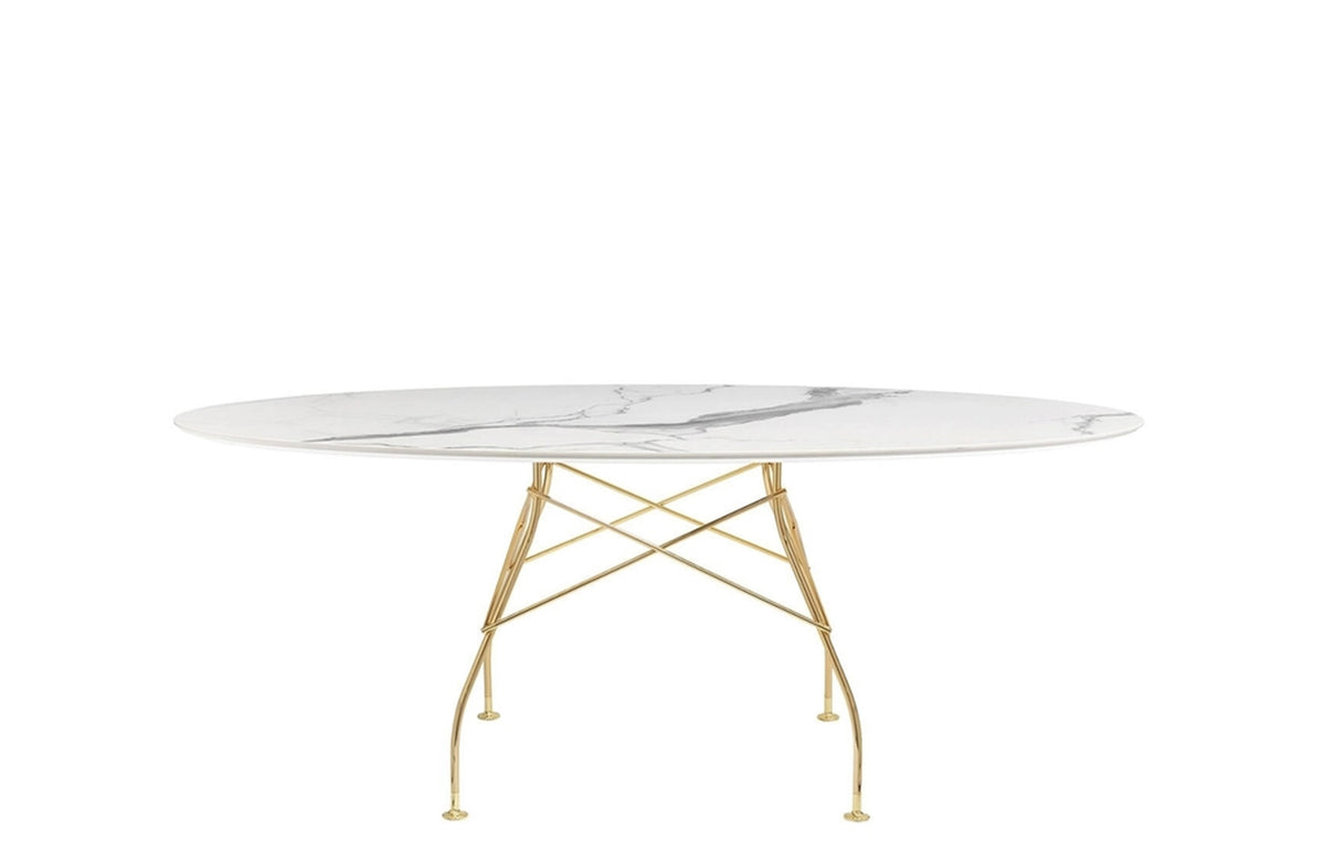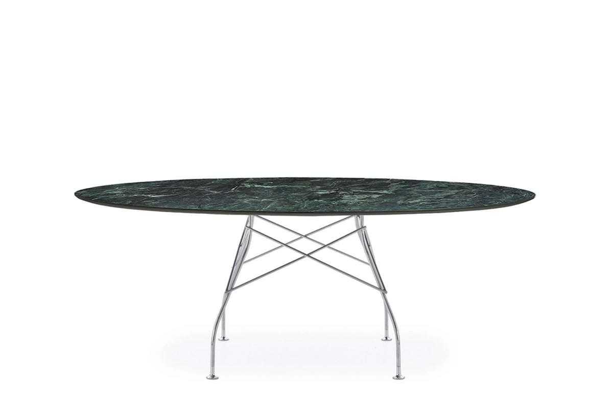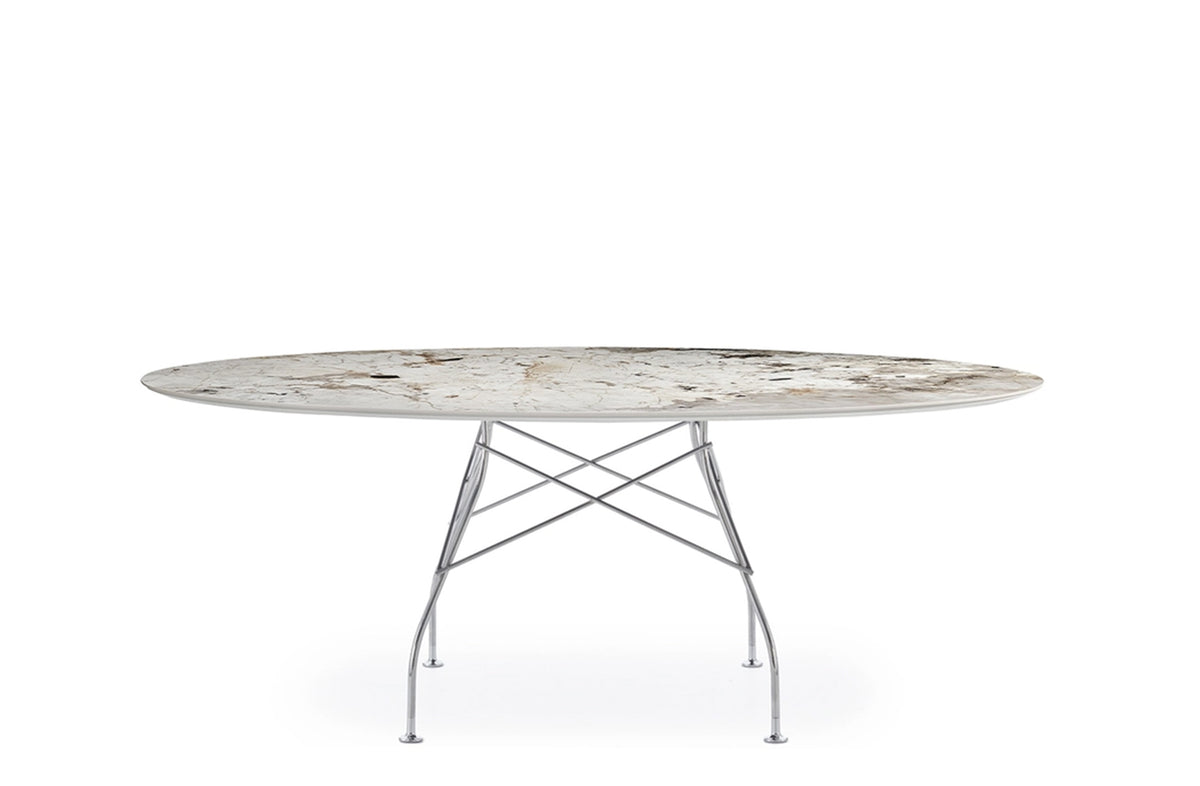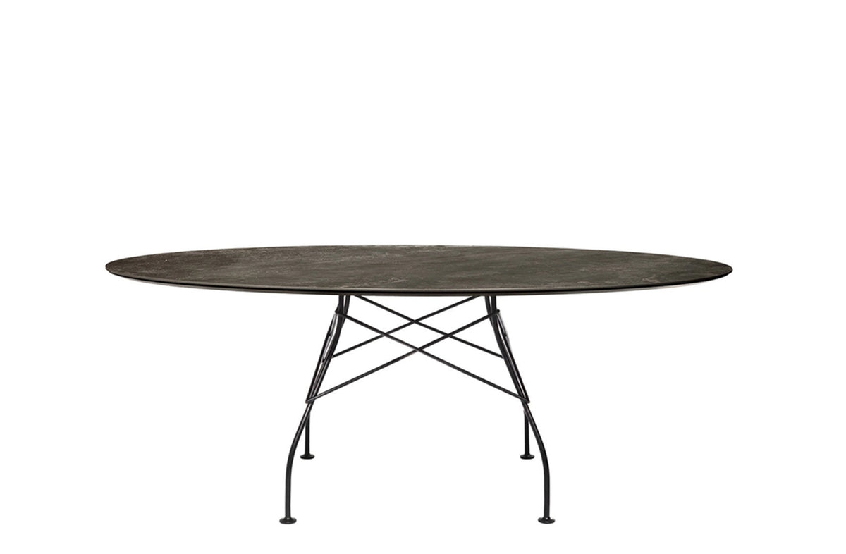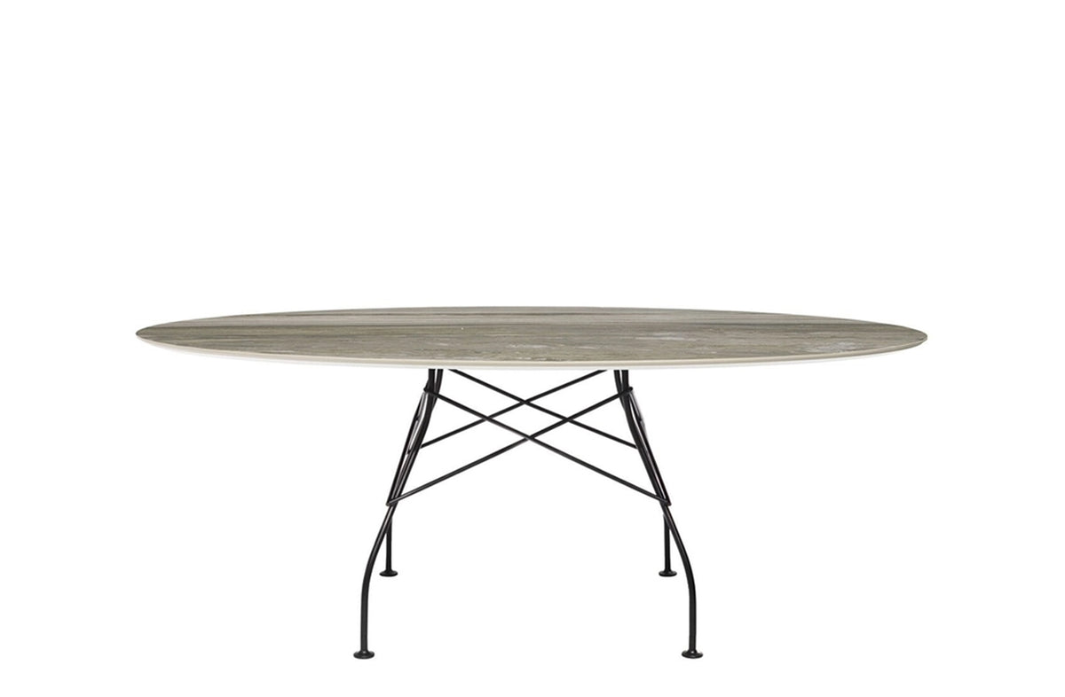 A family of tables ideal for the home and office. The light steel structure is made particular by the use of the cross element that joins the legs on each of the four sides, supporting the top. The collection comprises square, oval and round versions.