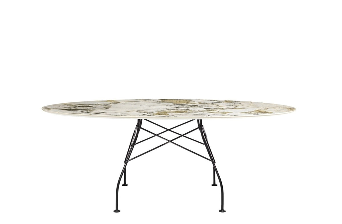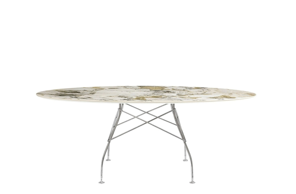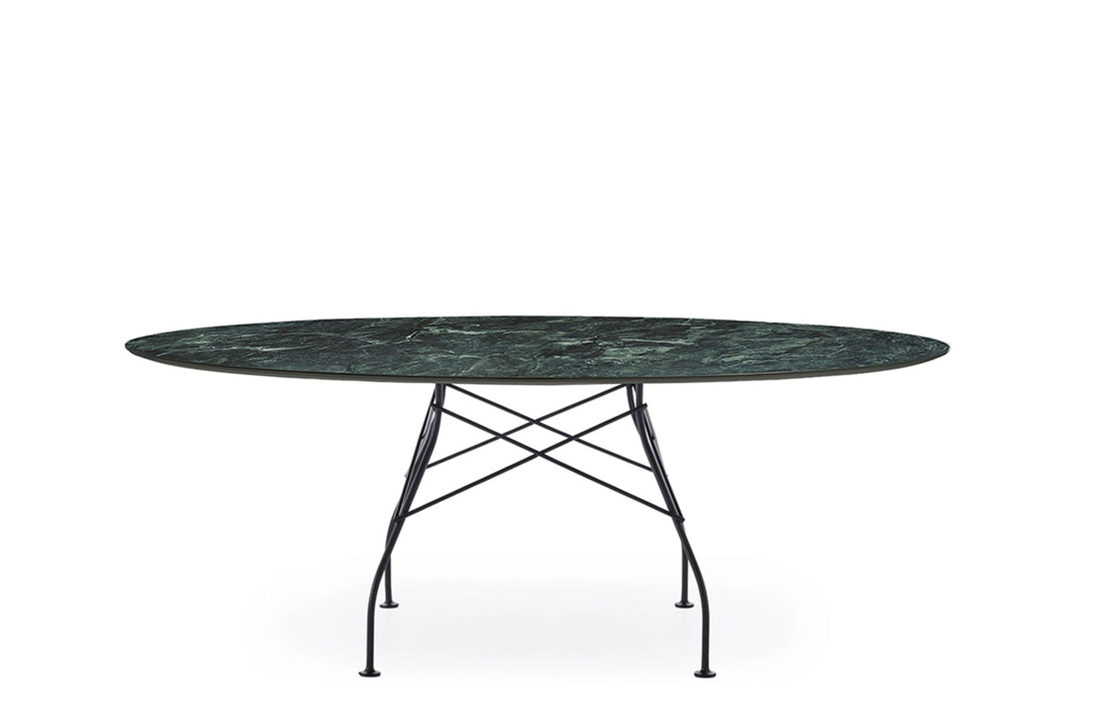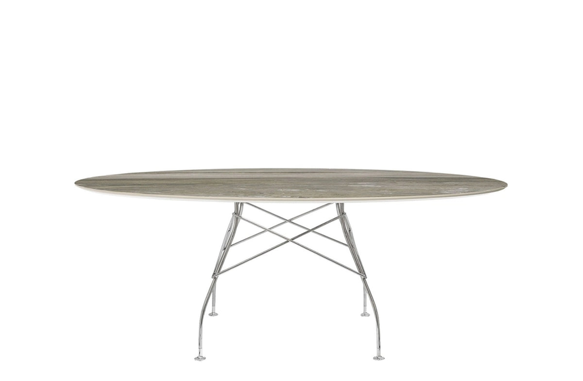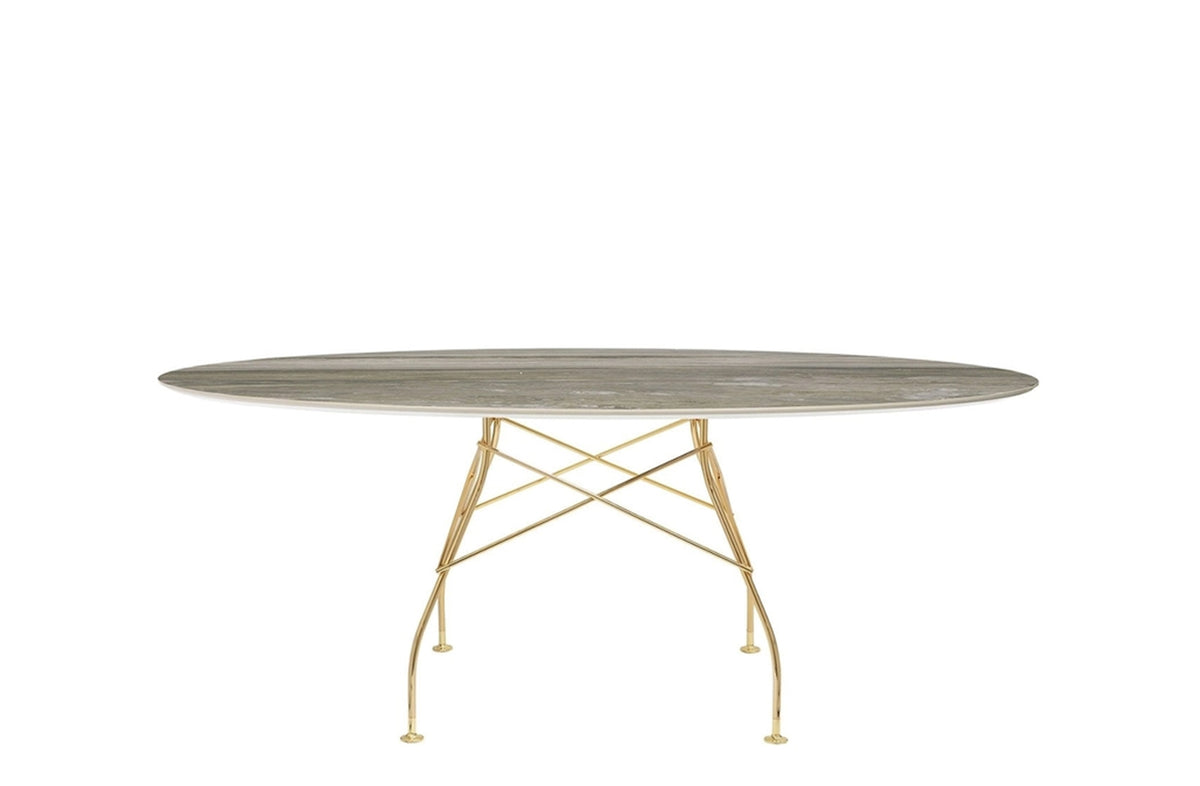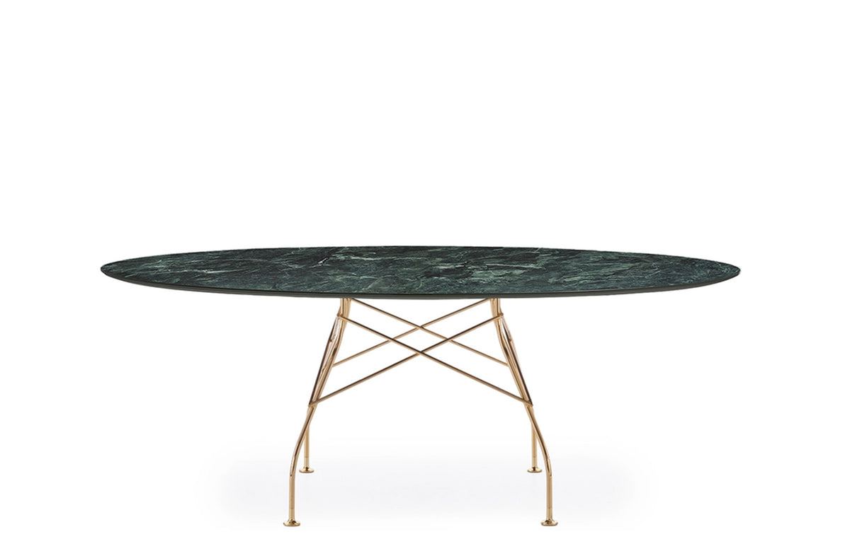 A family of tables ideal for the home and office. The light steel structure is made particular by the use of the cross element that joins the legs on each of the four sides, supporting the top. The collection comprises square, oval and round versions.