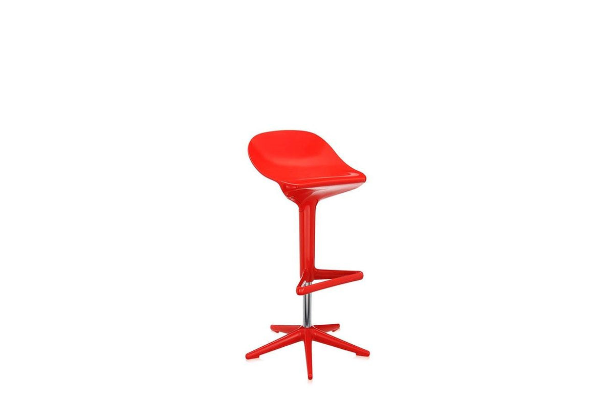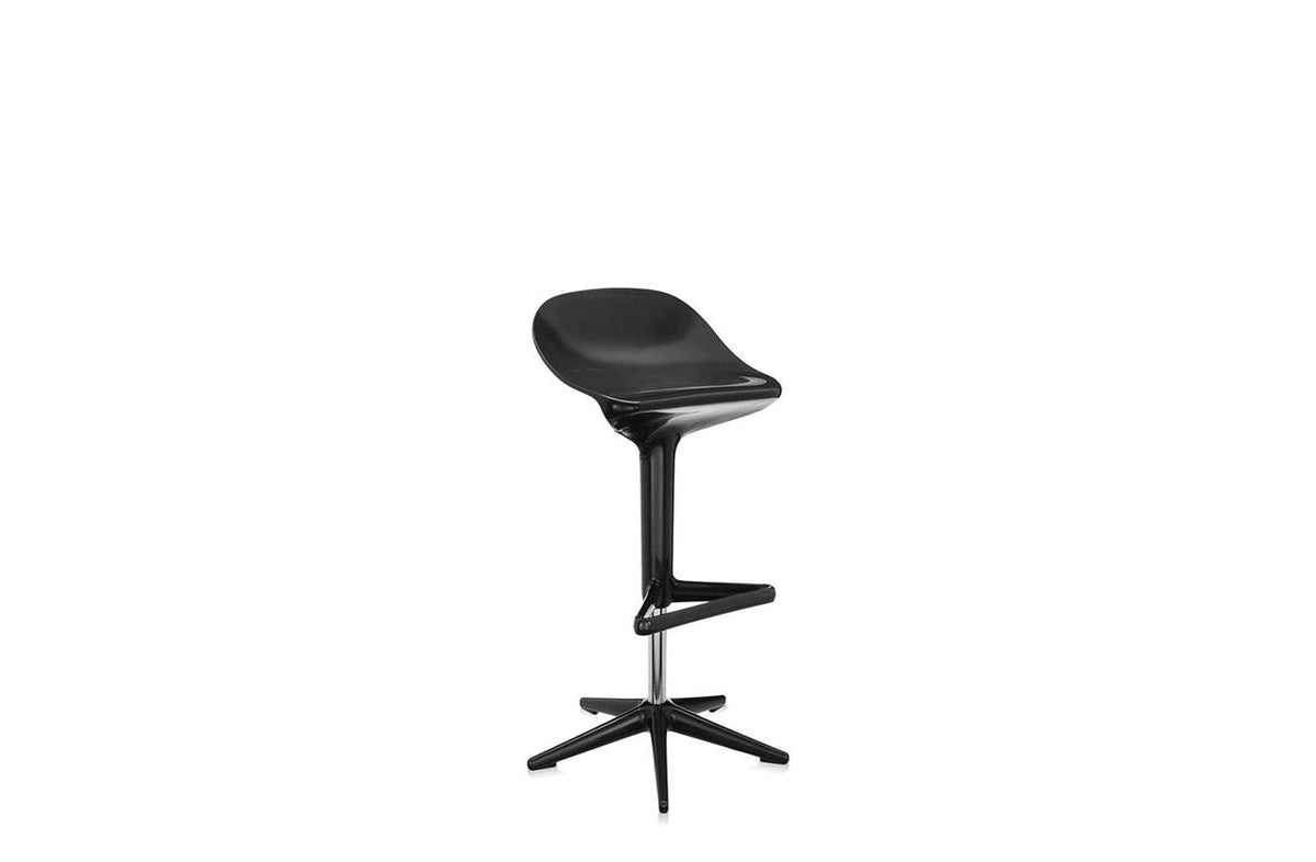 An original stool with a shape as elastic in appearance as it is in function. The innovation of Spoon consists mainly in attaching the seat to a central support with a specially reinforced curve to guarantee flexibility and comfort. Furthermore, thanks to a sophisticated design solution, the gas lift pump adjusts the height to between 56 and 76 cm and is perfectly inserted into the stem. In the same ingenious fashion, the handle which regulates the mechanism is perfectly concealed inside the seat.