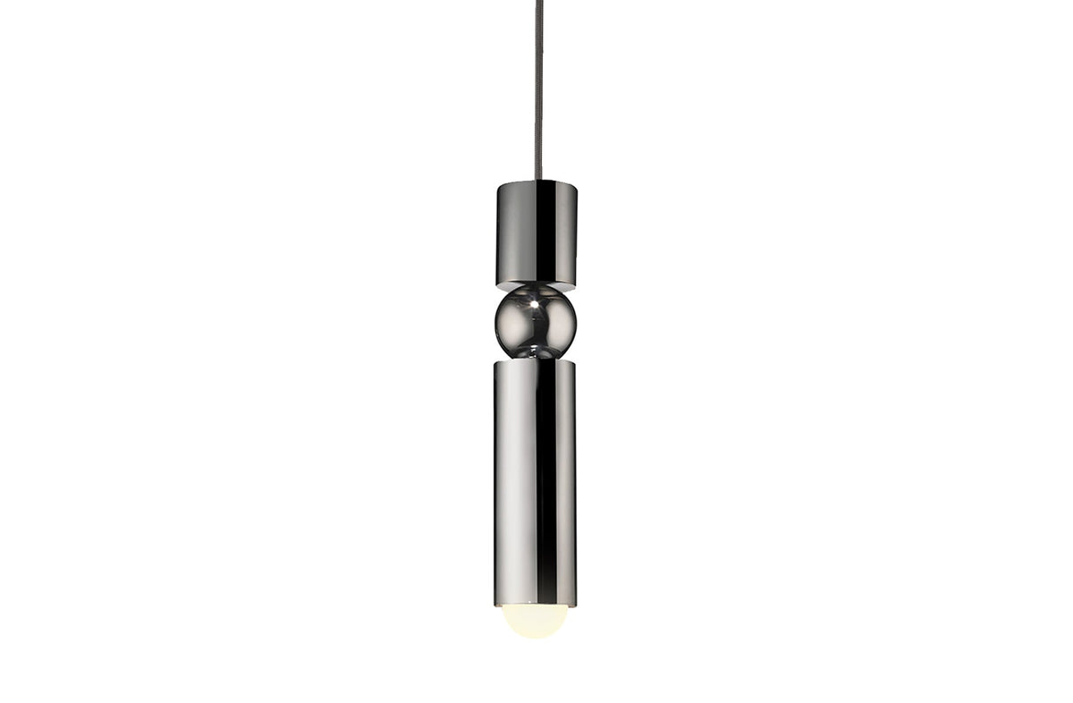 Continuing the exploration of pivots and supports, Fulcrum Light is a slimline pendant of gold, chrome or black cylinders suspended around a central sphere.