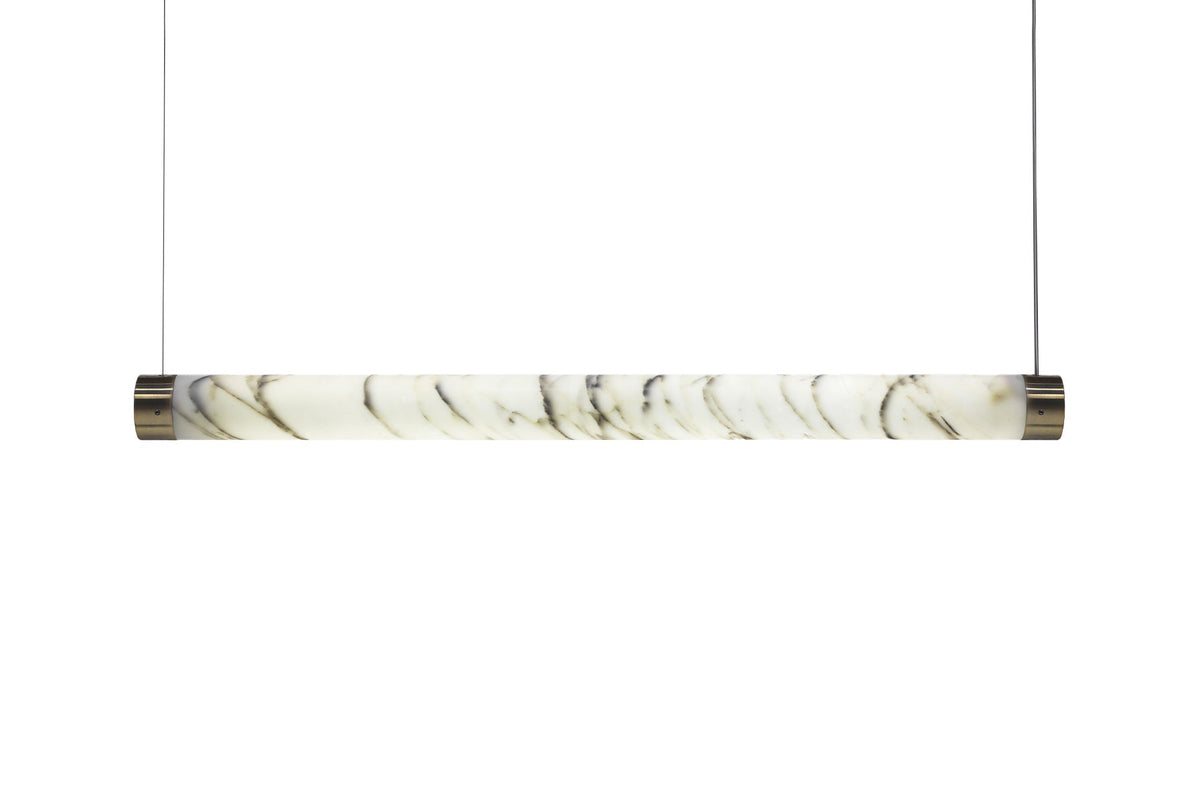 Skillfully milled from a single piece of Carrara marble and finished at each end with brass or chrome bands, Tube contains a strip of LED bulbs resulting in what appears to be a solid length of warm glowing stone. The unique veins of each piece of marble mean no two lights are exactly the same. A handcrafted twist on the traditional fluorescent tubelight.