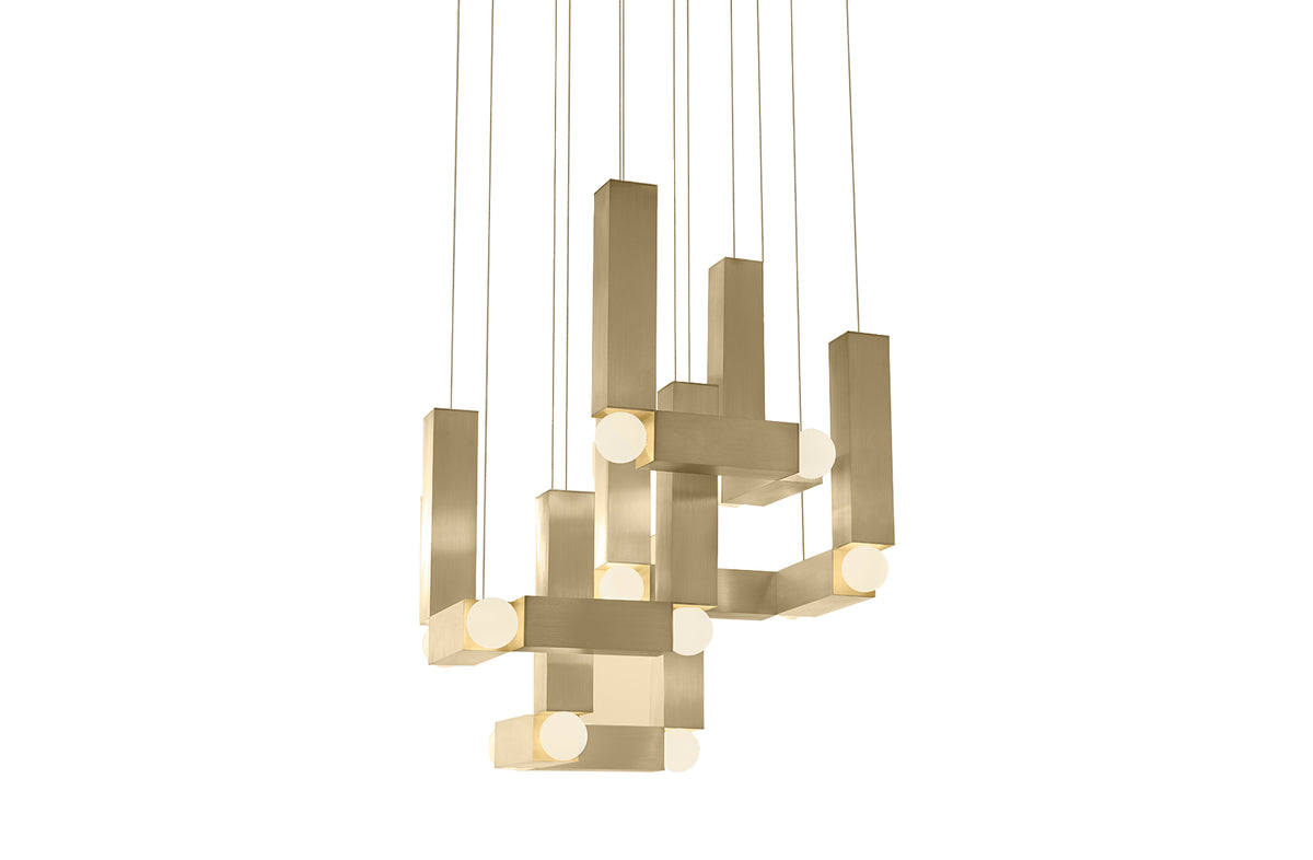 Vesper is inspired by the simple geometric lines of Brutalist sculpture and modernist cathedral lighting. Formed with extruded aluminium and available in anodized gold or silver, Vesper explores the delicate balance and interconnection of its rectangular cubes that are seamlessly connected by illuminated spheres.