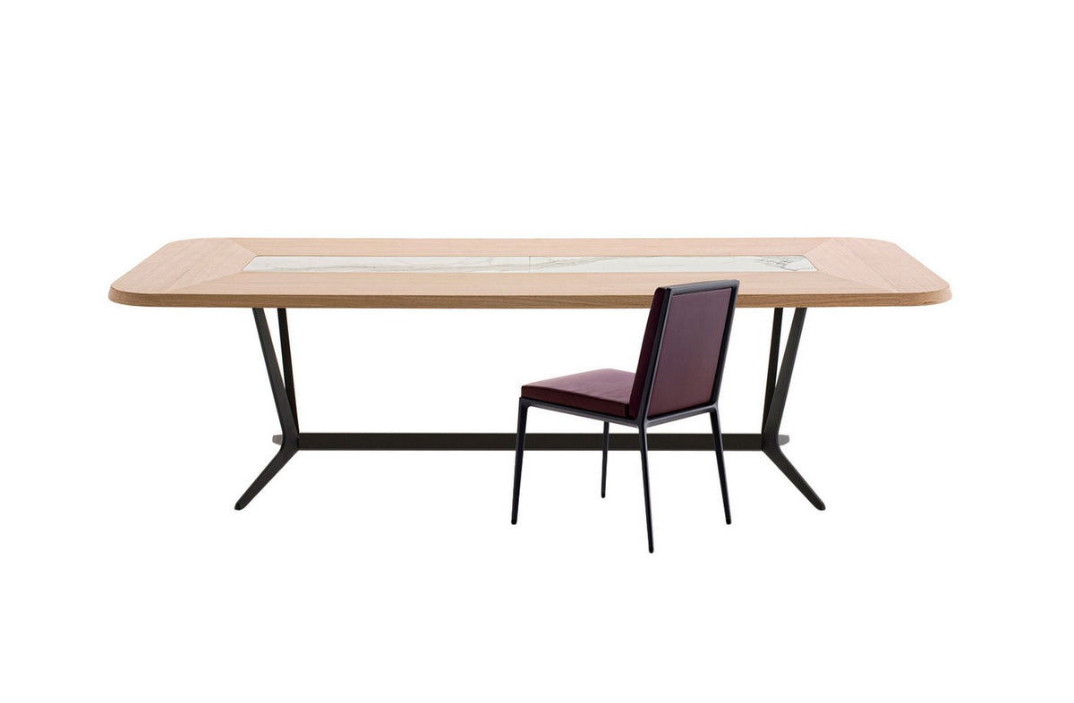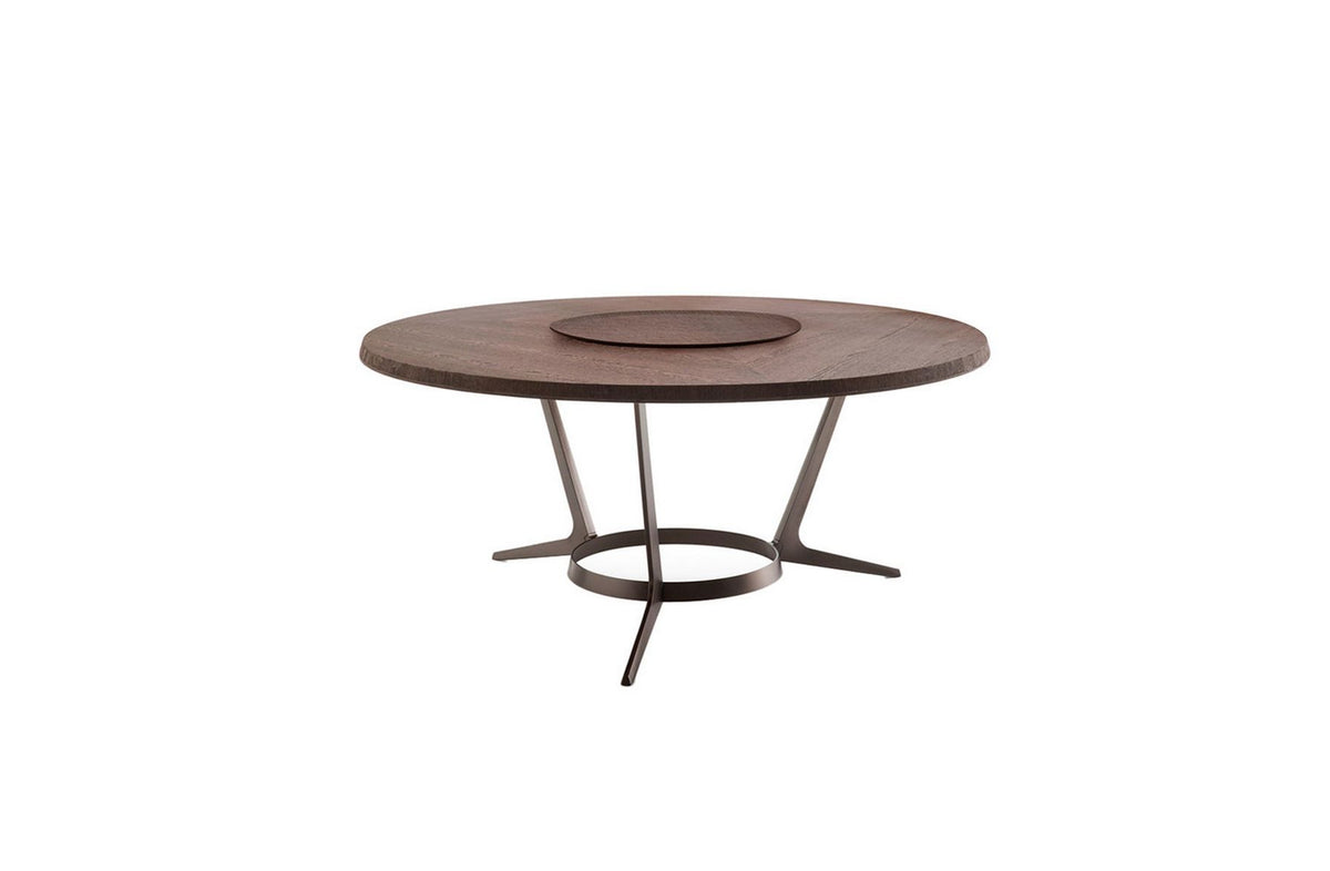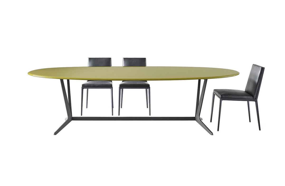 Astrum is the new table collection, rectangular, round and oval, distinguished by the special “sawhorse” base-frame. The frame is made of a single die-cast aluminium support with graphite or amber painted finish that, based on the table shape, is composed of two or three elements connected by a crosspiece and forming the base-frame for rectangular tables (width cm 100 and three lengths cm 230, 280 and 340), while three elements connected at the base of a steel ring establish the support for round tables (diameter cm 165 and 200).