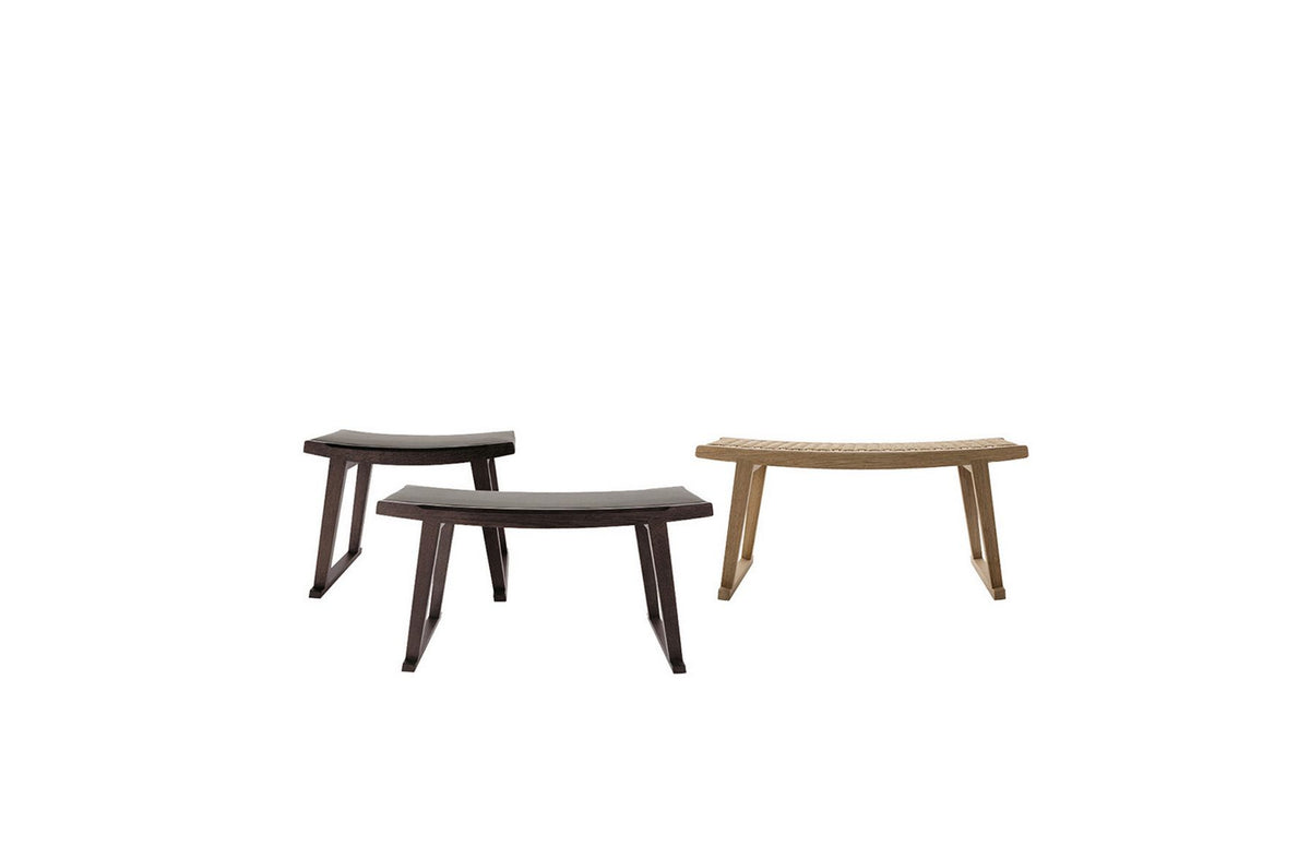 A bench recalling oriental patterns with a concave seat that can be covered with fabric or leather or with interlacing in natural cellulose rope.