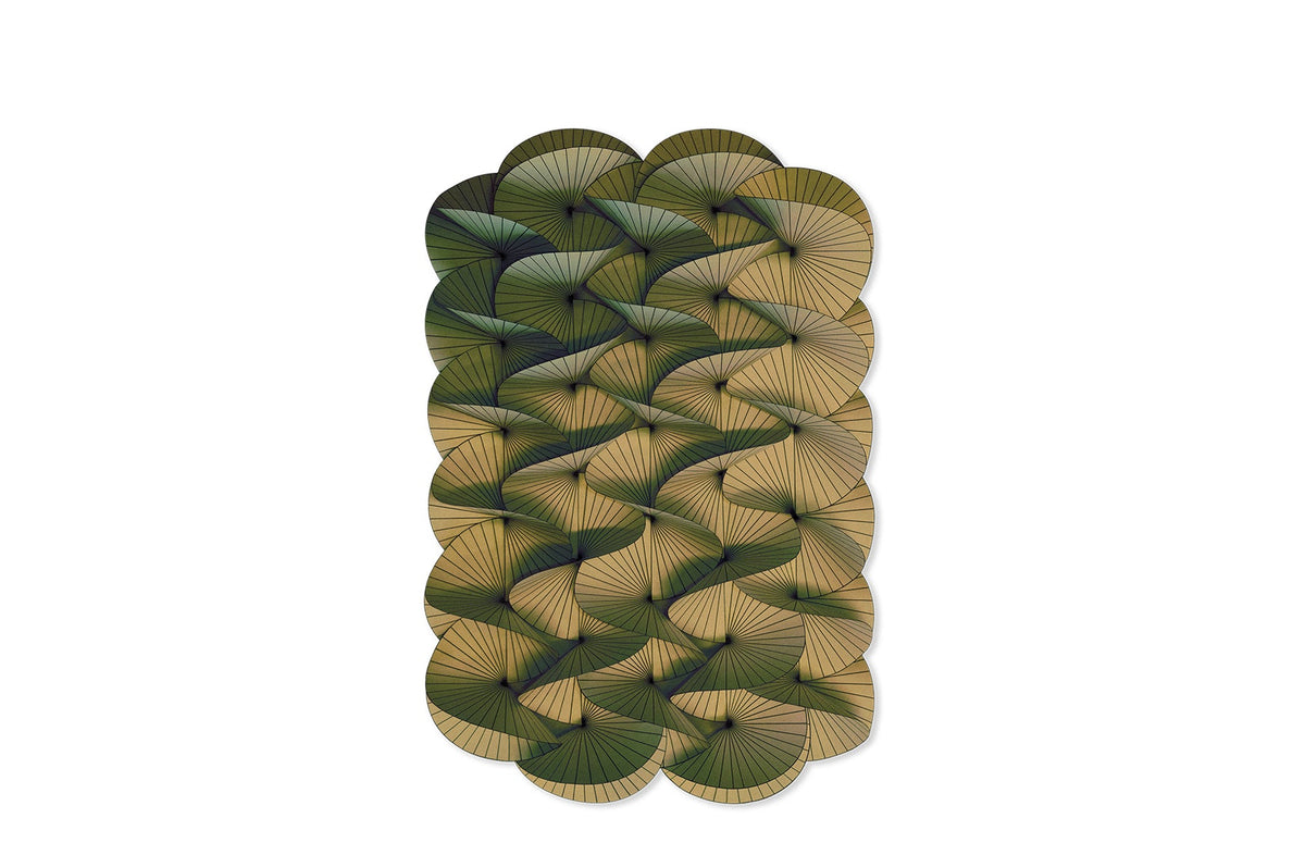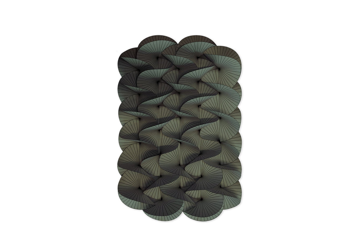 A play with cut paper creates an organic and twisted shape - a swirl like a serpentine. A gradient of colors appears in the light and shadows giving the illusion of a three-dimensional pattern on the rug.