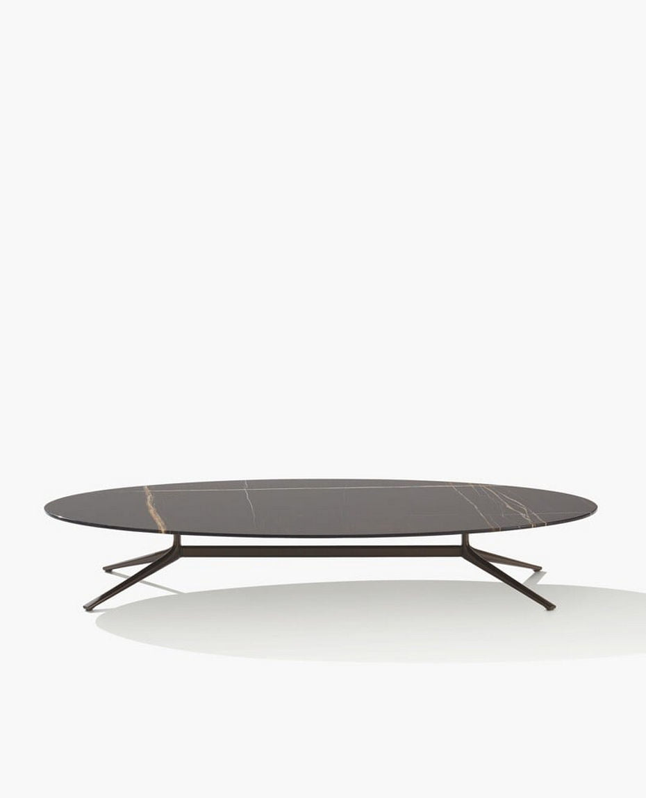 A collection of coffee tables which are light and elegant. Original structures in aluminium, available in two sizes, making it easy to combine them with more elements. These coffee tables supports thin table tops available in a wide range of embellished surfaces.