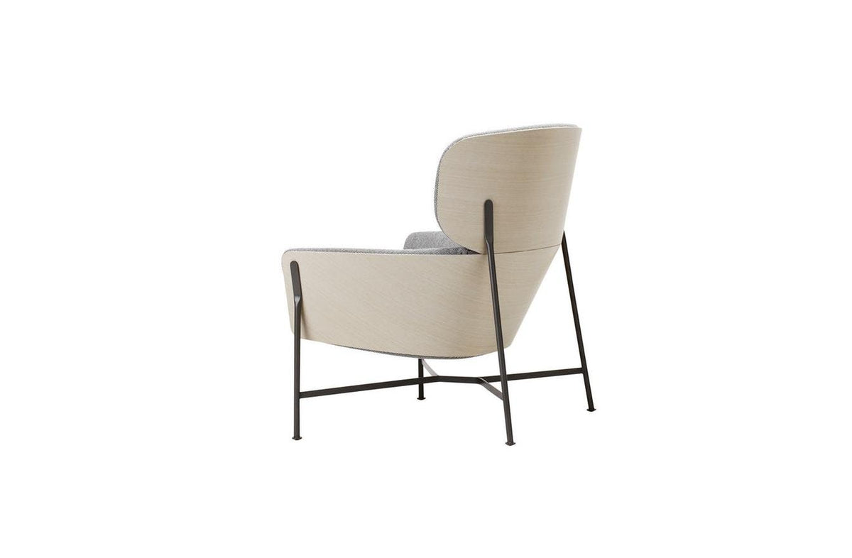 The contoured timber shell and soft upholstery are cradled within a sleek steel frame.